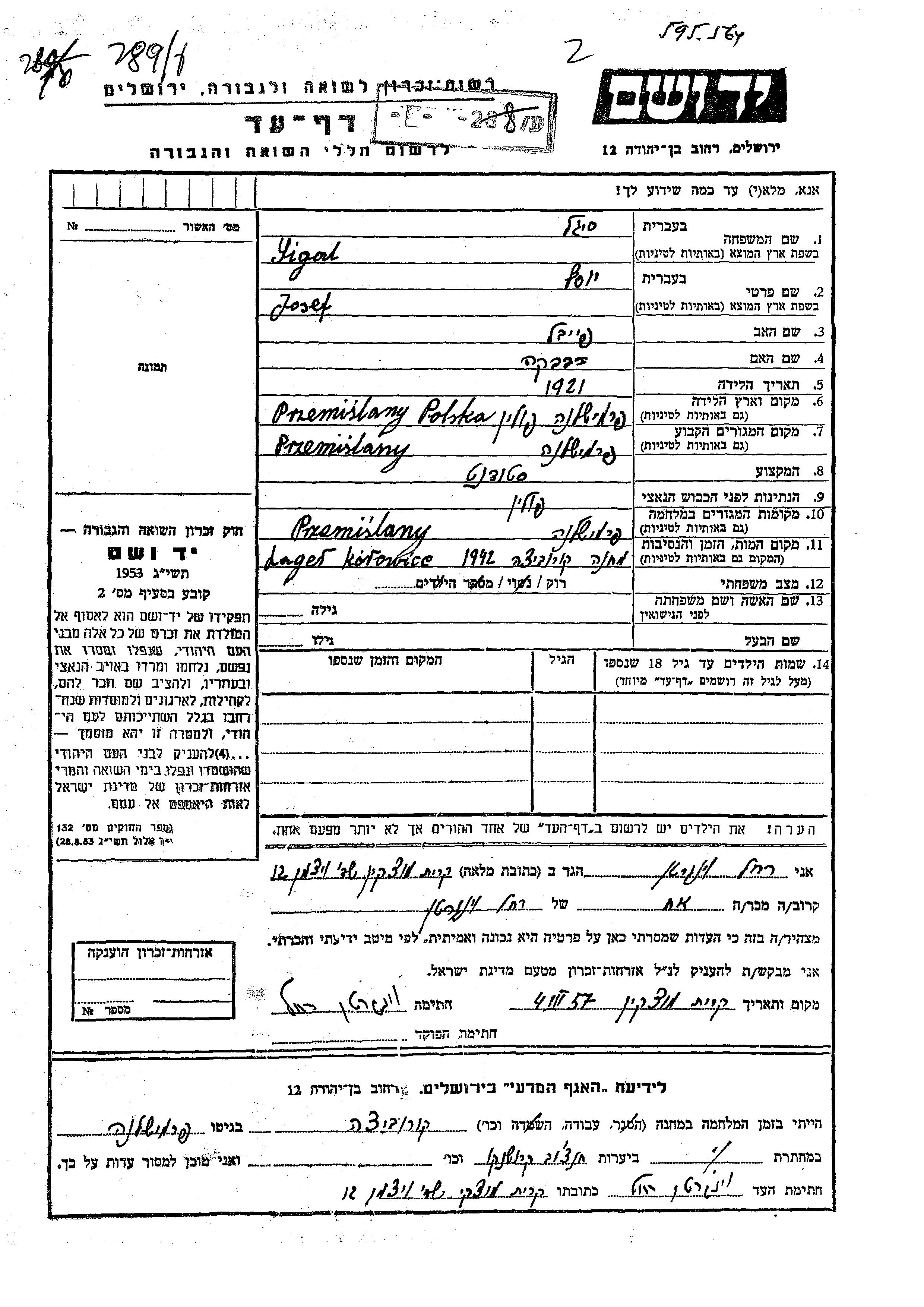 Sigal Josef 1921 Przemyslany, Pologne Feuille de témoignage
