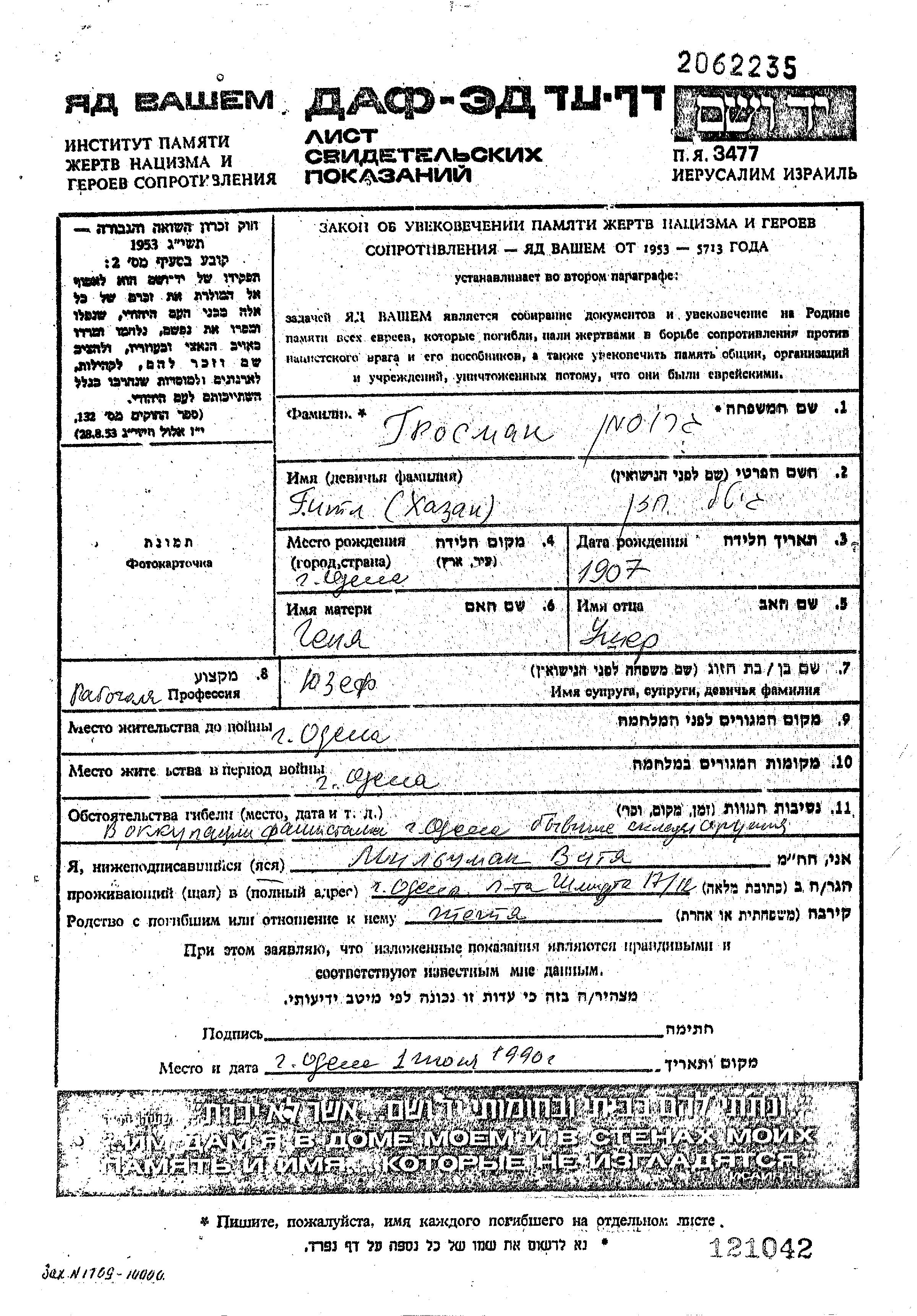 Grosman Gitl 1907 Odessa, Ukraine (URSS) Feuille de témoignage
