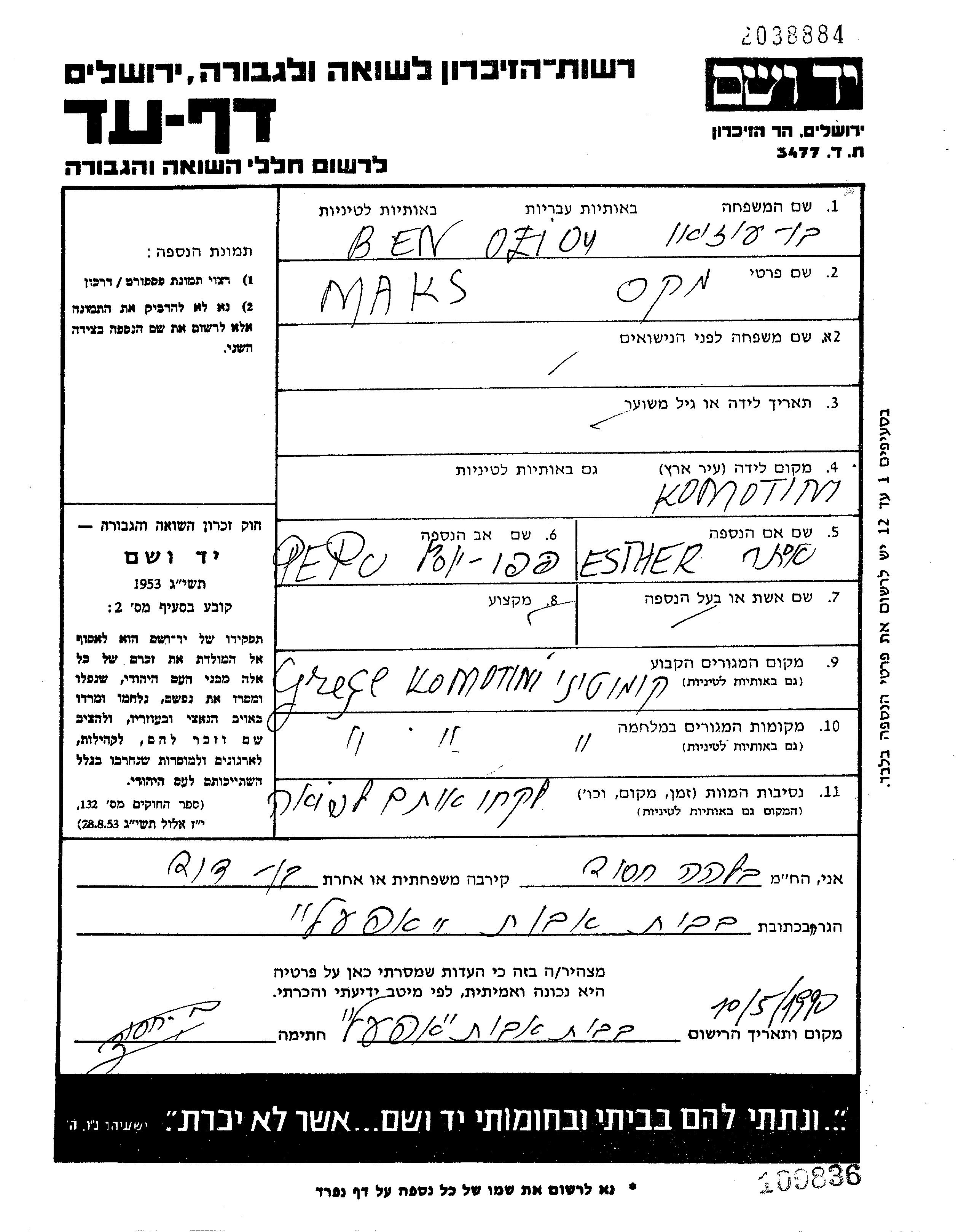 Ben Ouziou Max Komotini, Grèce Feuille de témoignage