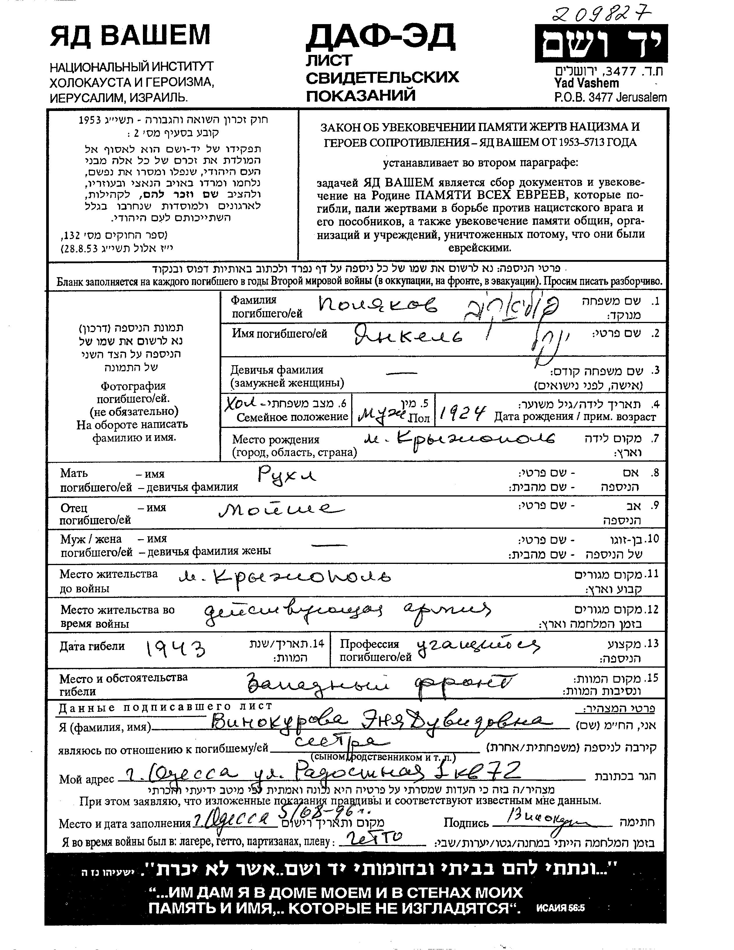 Polyakov Yankel 1924 Kryzhopol, Ukraine (URSS) Feuille de témoignage