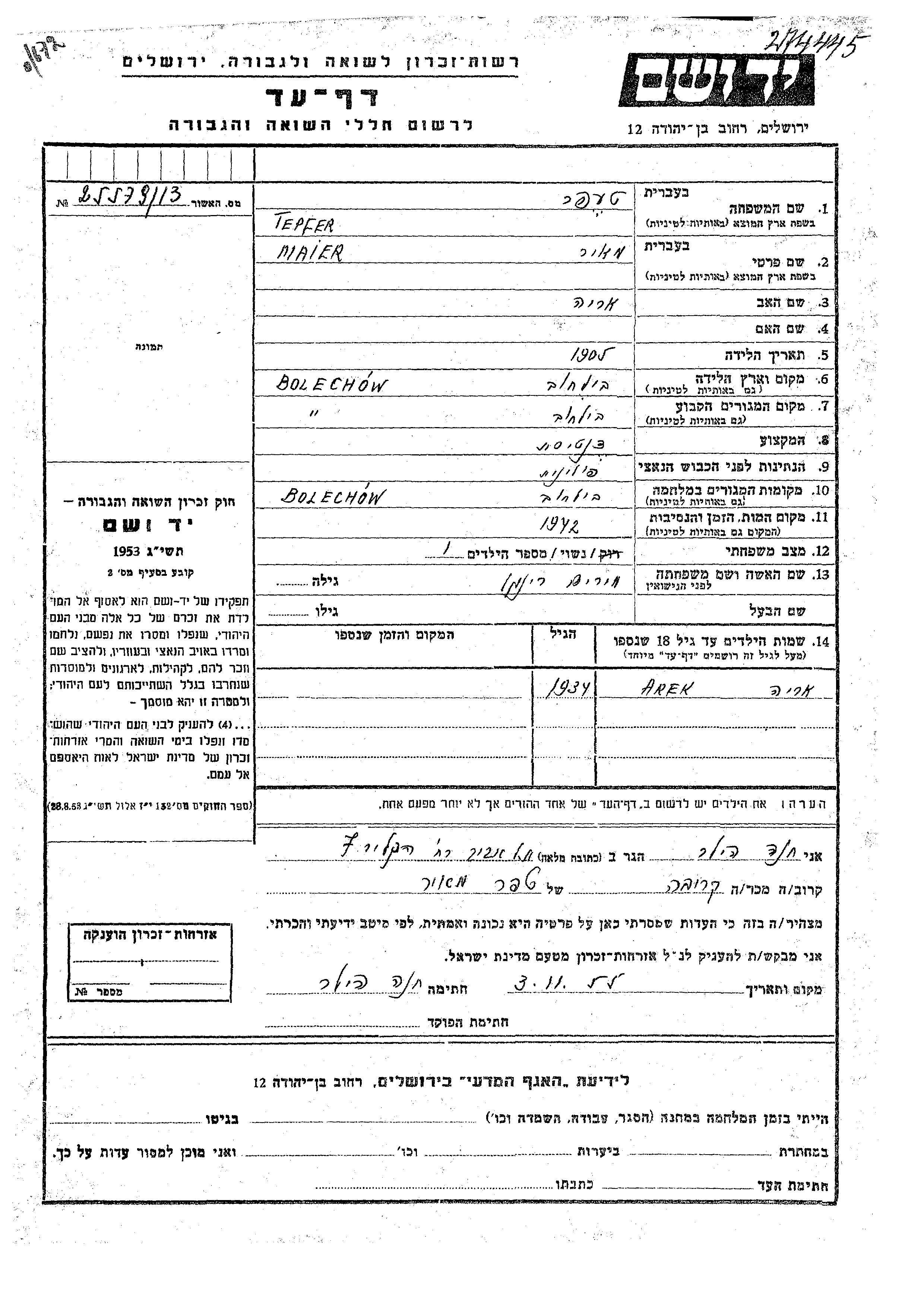 Tepfer Teper Maier 1905 Bolechow, Pologne Feuille de témoignage