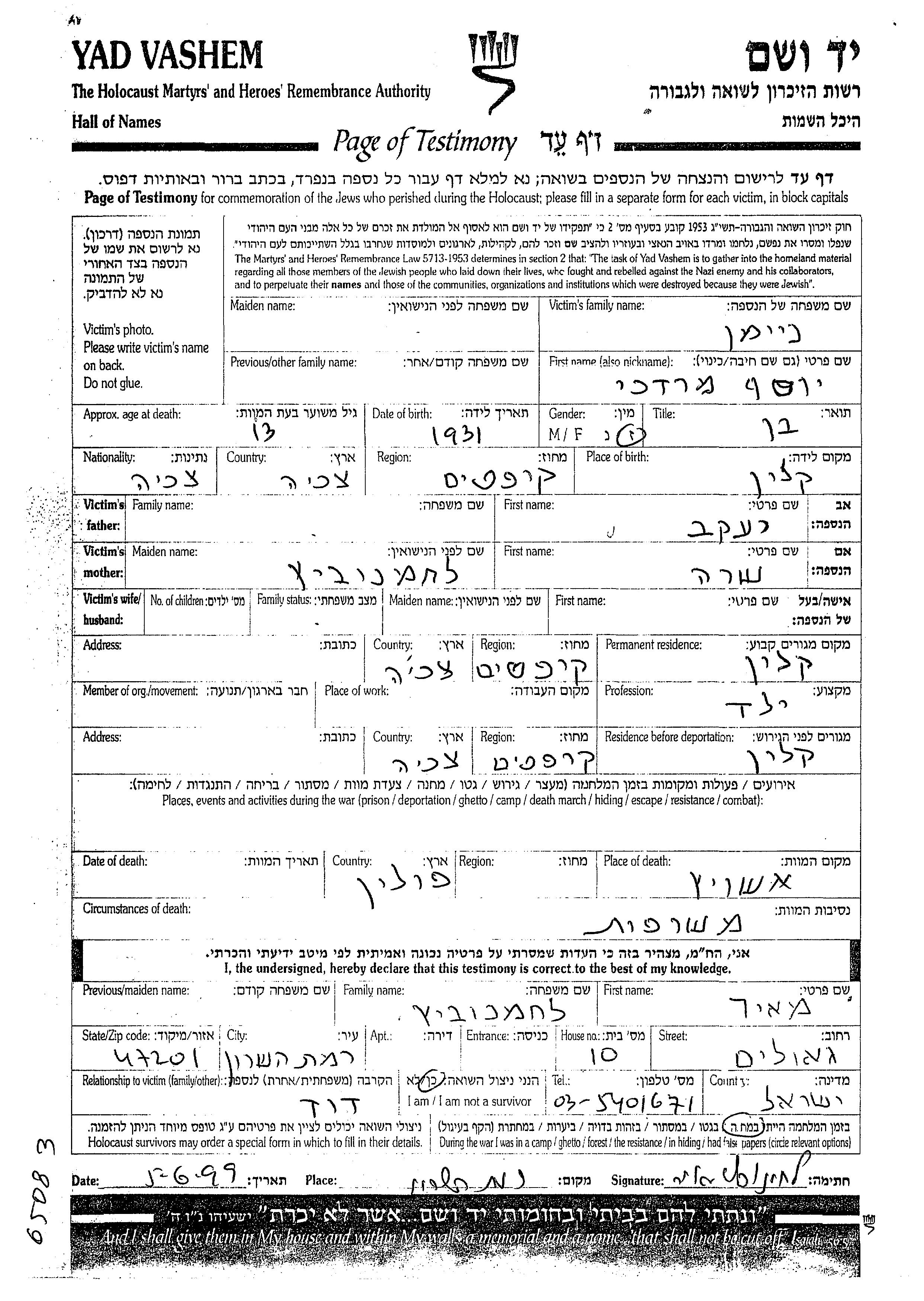 Neiman Yosef 1931 Kalin, Tchécoslovaquie Feuille de témoignage