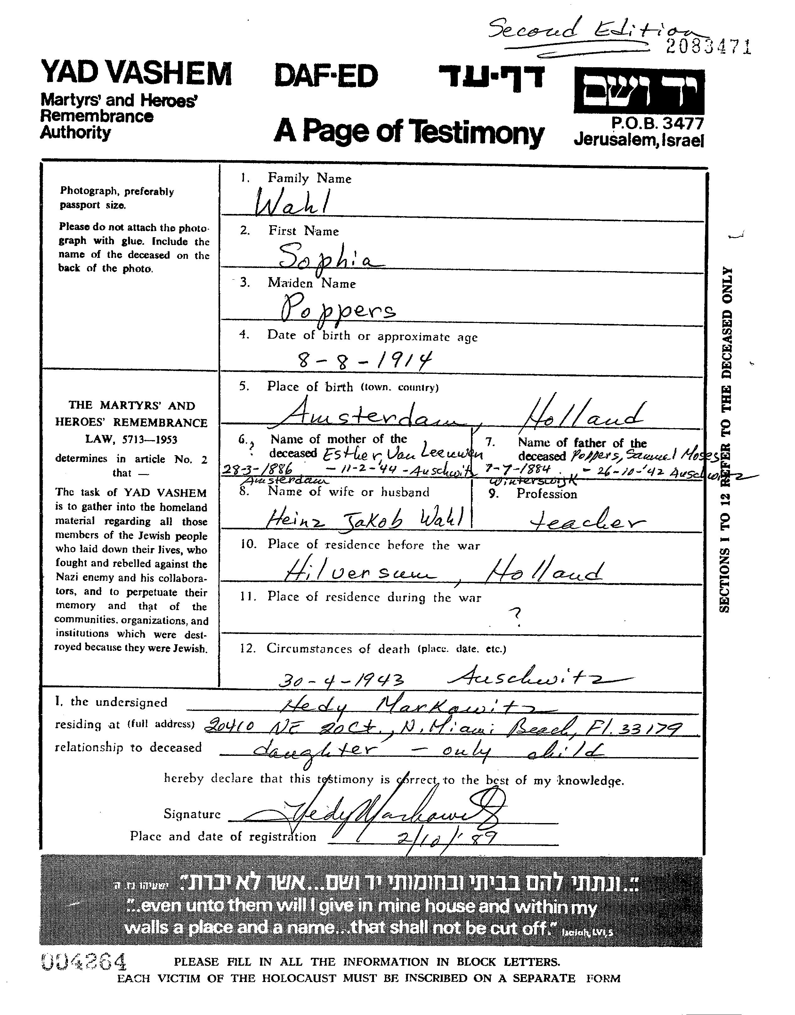 Wahl Sophia 1914 Amsterdam, Pays-Bas Liste des Juifs des Pays-Bas assassinés
