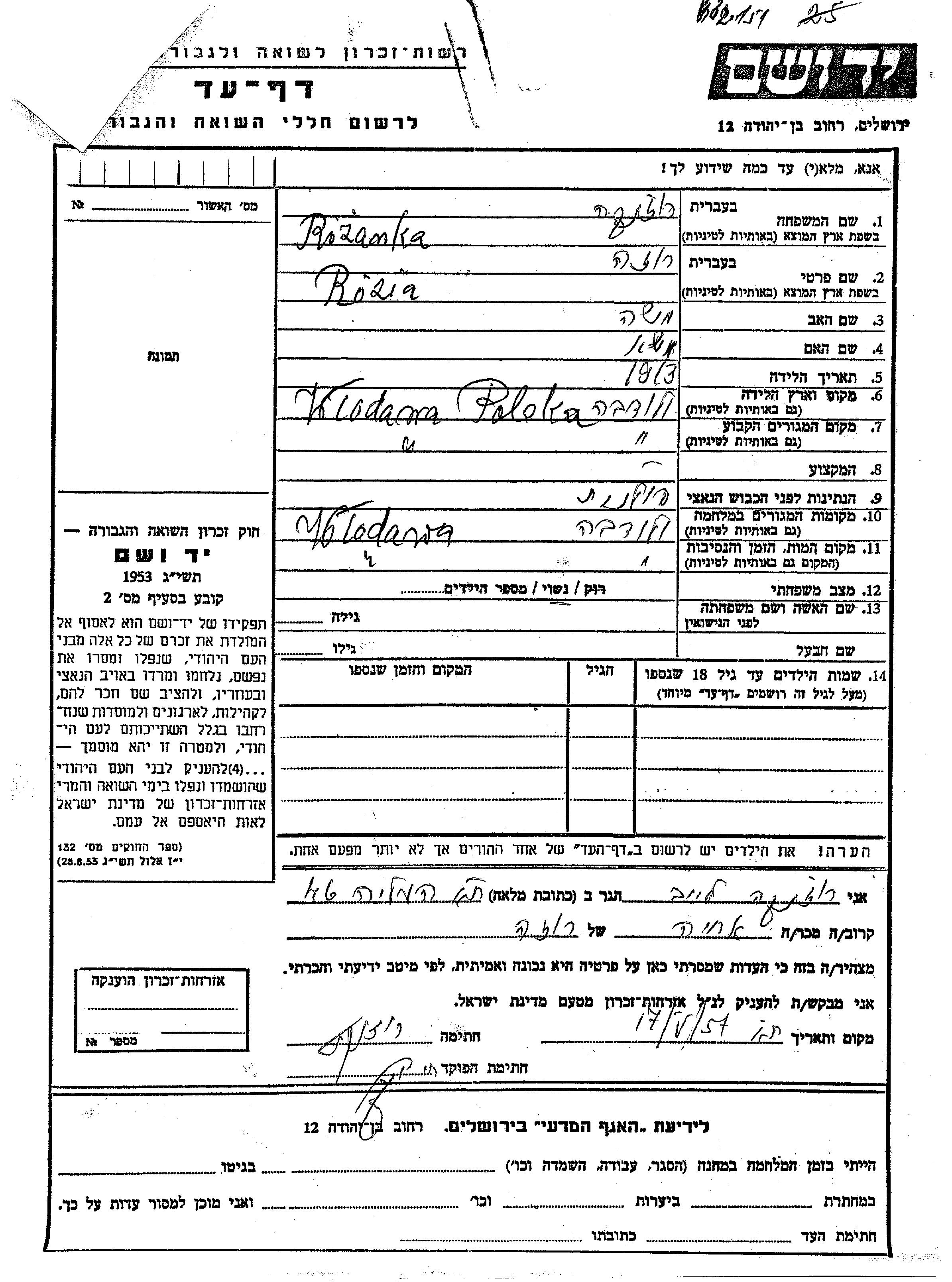 Rozhanka Roza Wlodowa, Pologne Feuille de témoignage