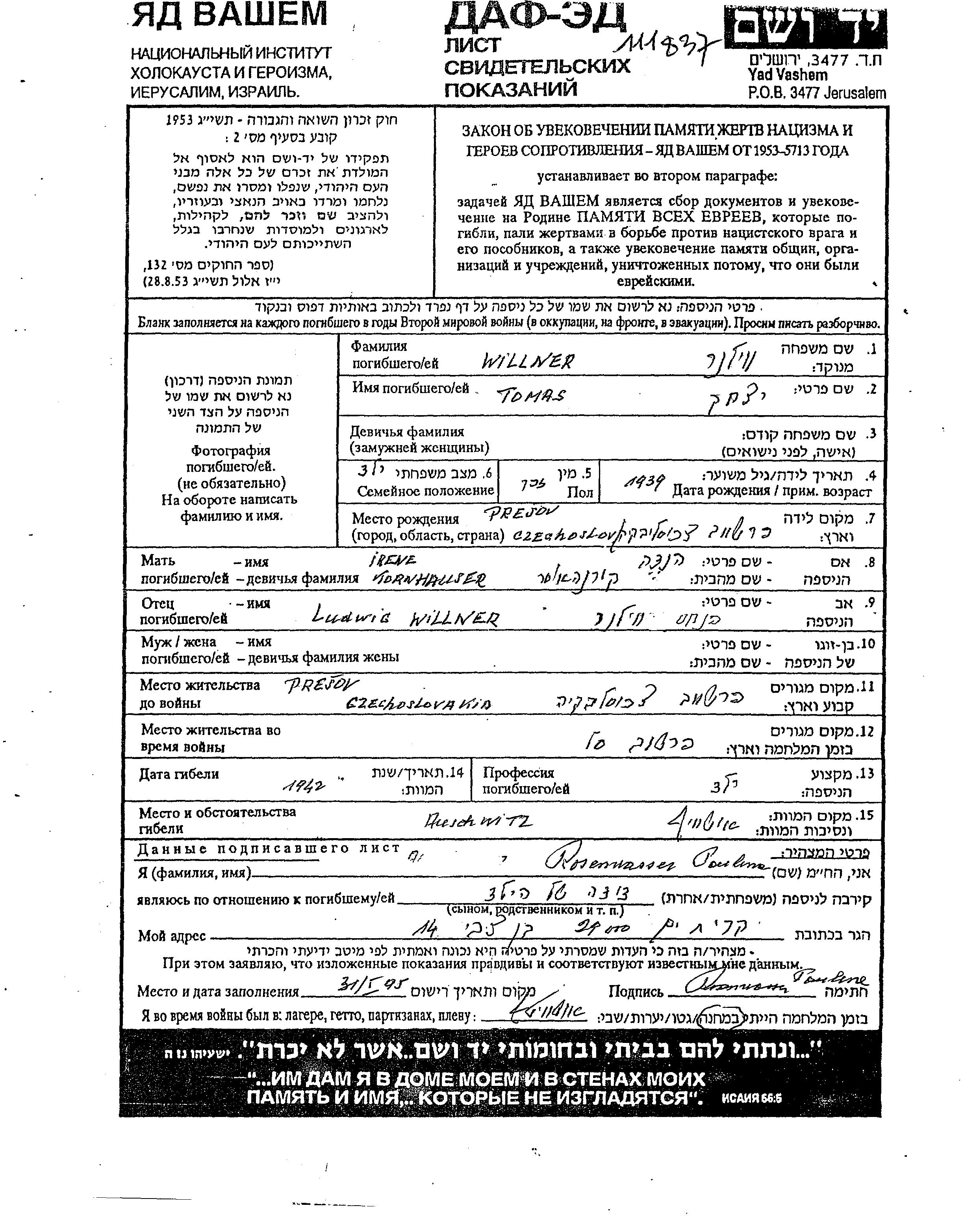 Willner Ytzkhak Tomas Presov, Tchécoslovaquie Feuille de témoignage
