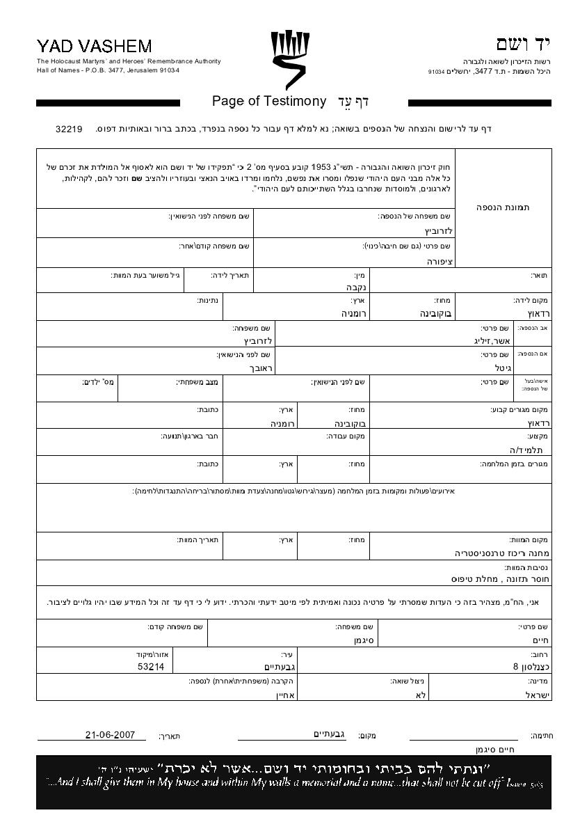 Lazarovitz Tzipora Radautz, Roumanie Feuille de témoignage (digitale)