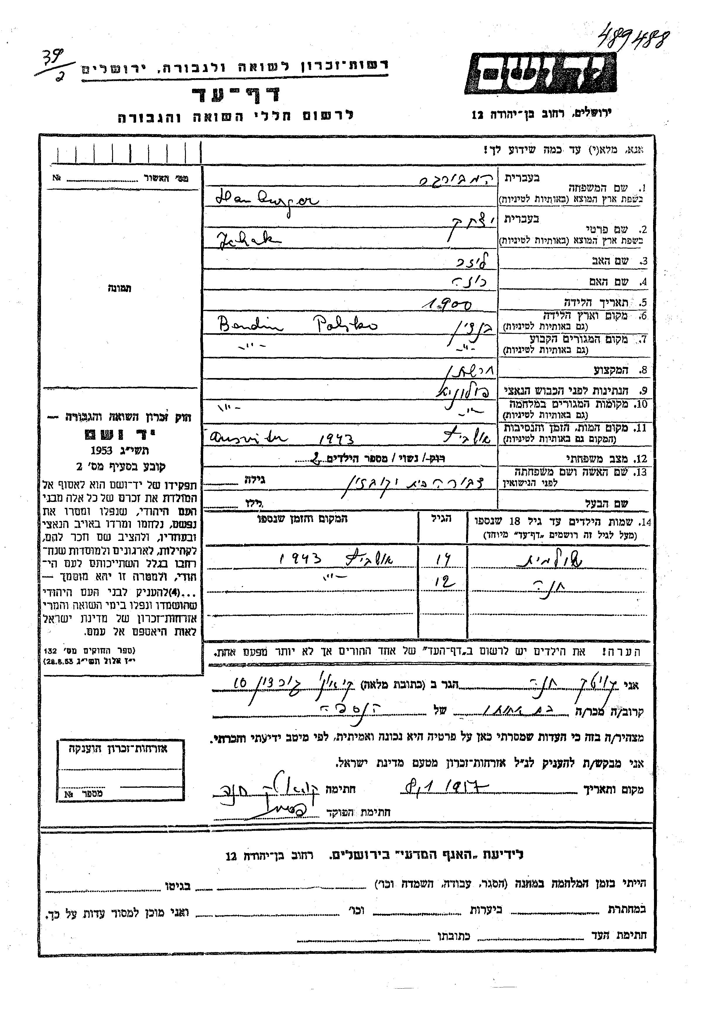 Yad Vashem - Pages of Testimony Names Memorial Collection