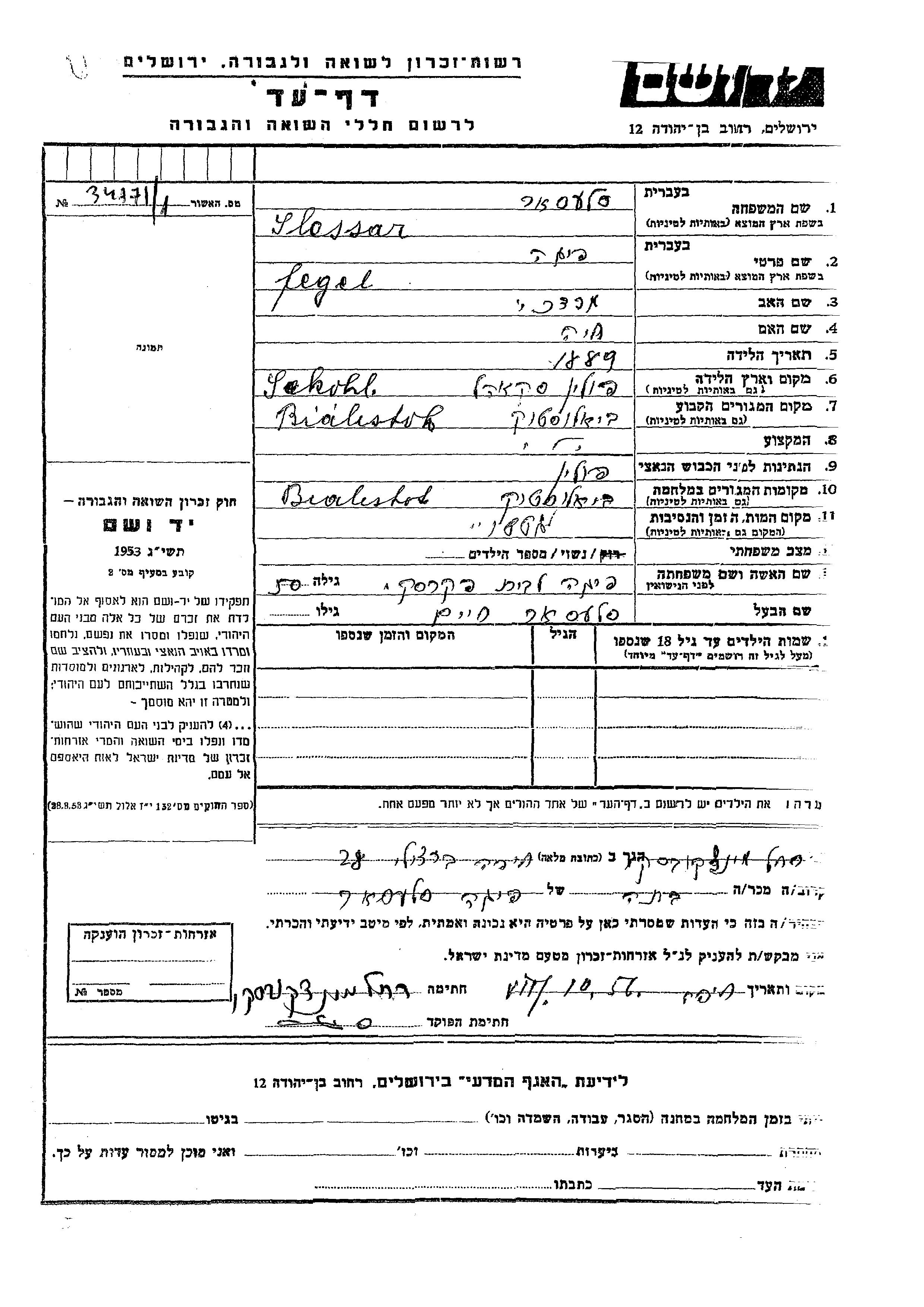 Fegel a été assassinée pendant la Shoah. Lieu de la mort: Bialystok, Pologne.