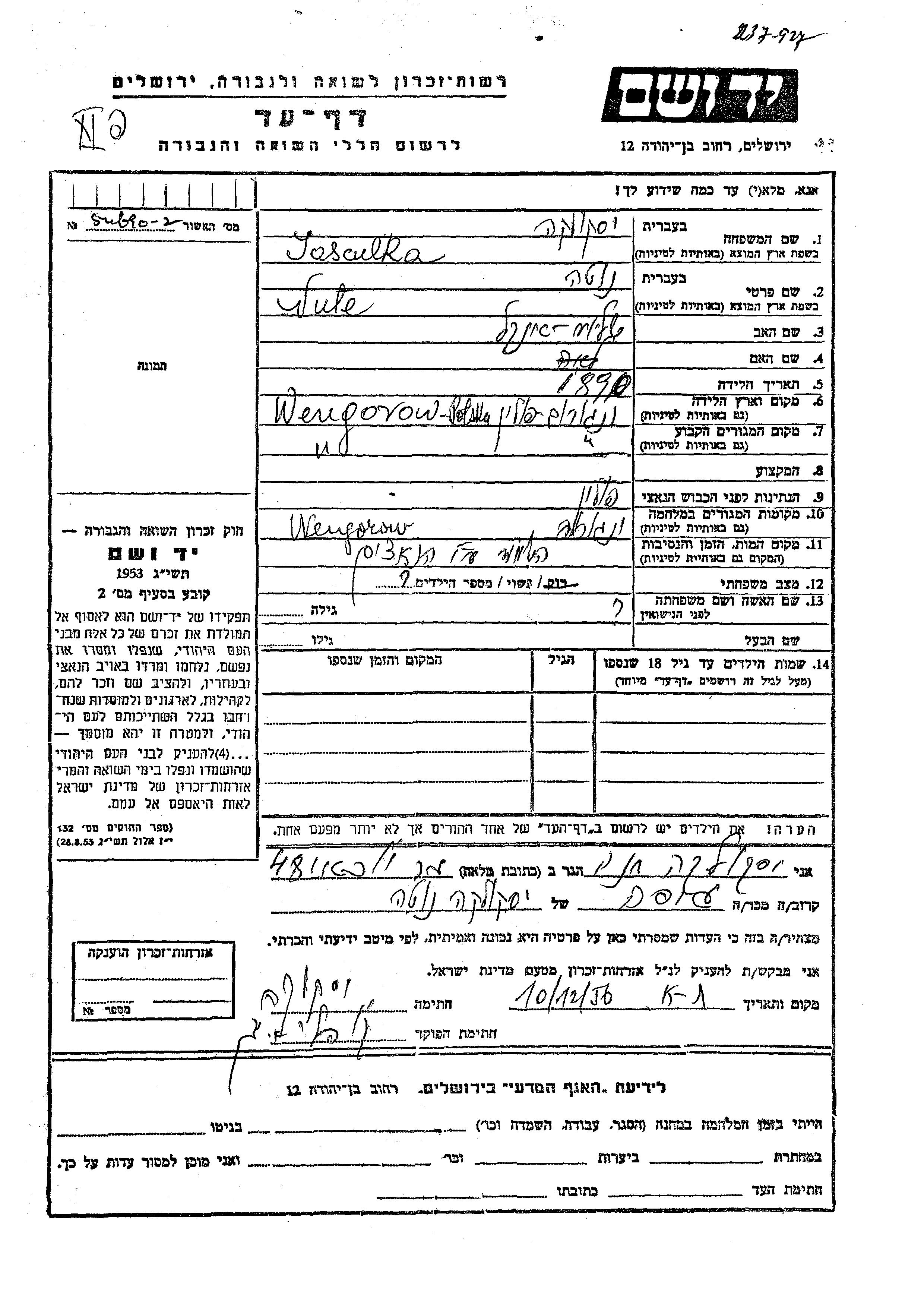 Yad Vashem - Pages of Testimony Names Memorial Collection