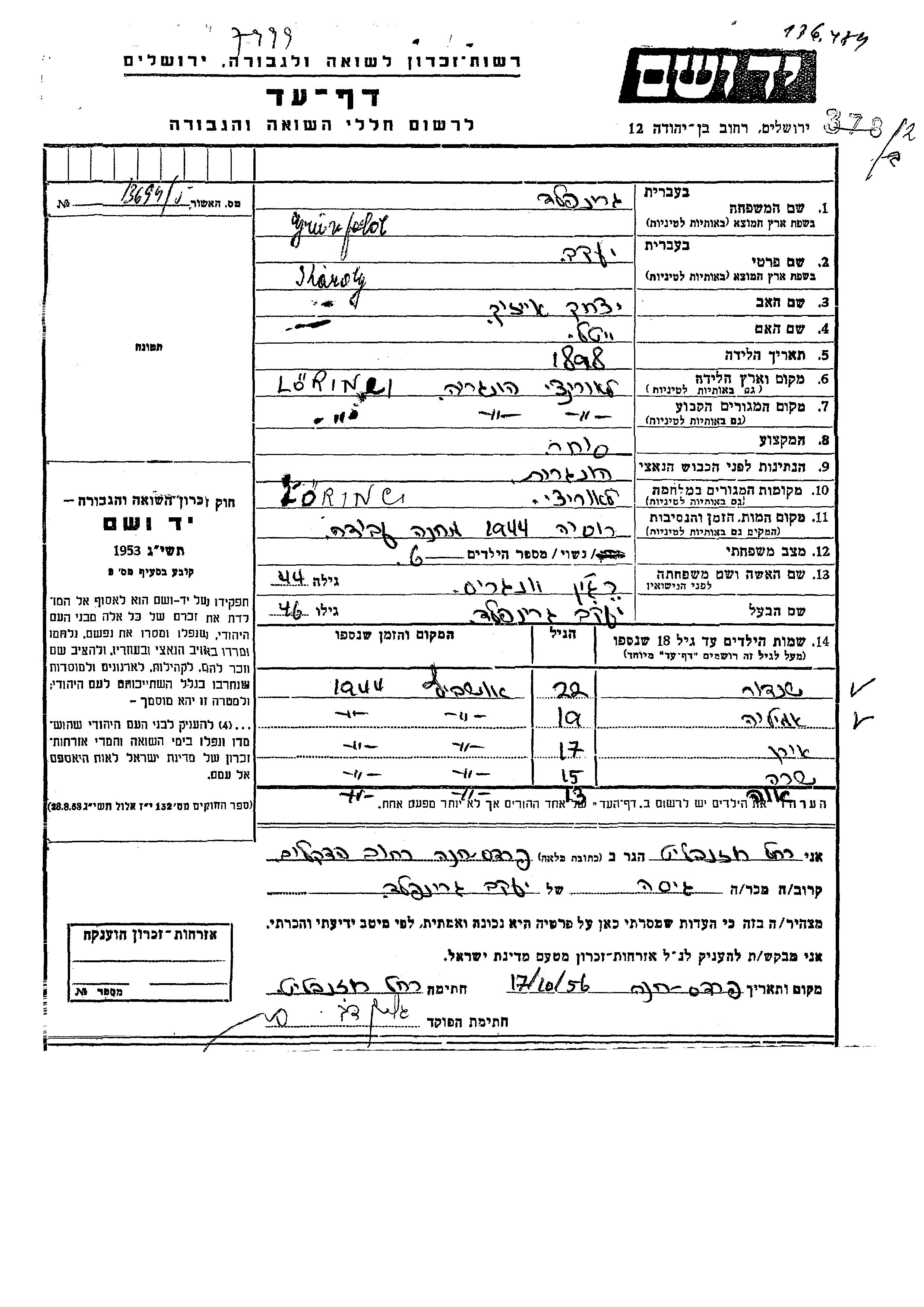 Gruenfeld Karoly Yaakov 1898 Lorinci, Hongrie Feuille de témoignage
