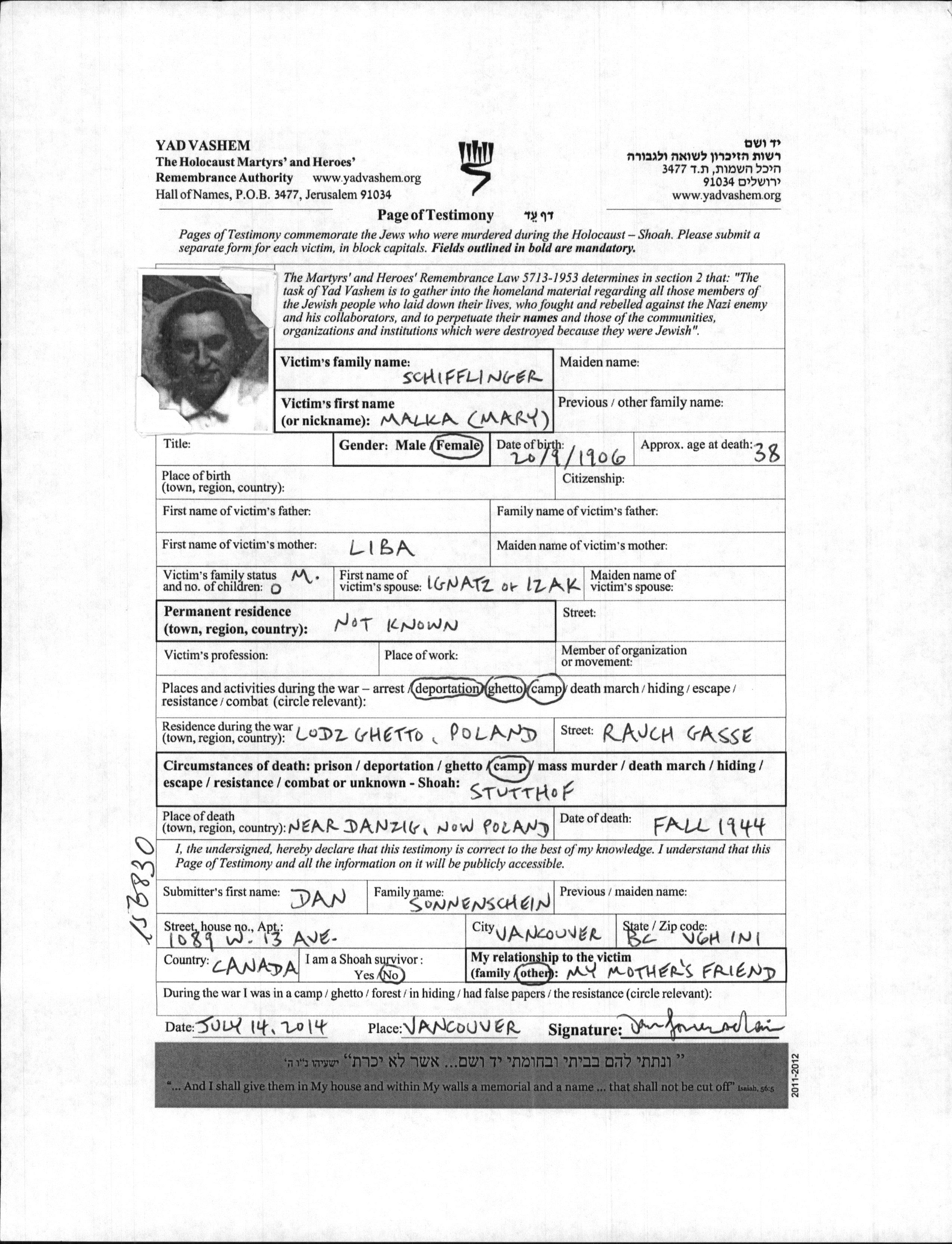 Schifflinger | Malka Mary | 1906 | endroit inconnu, | Feuille de témoignage |