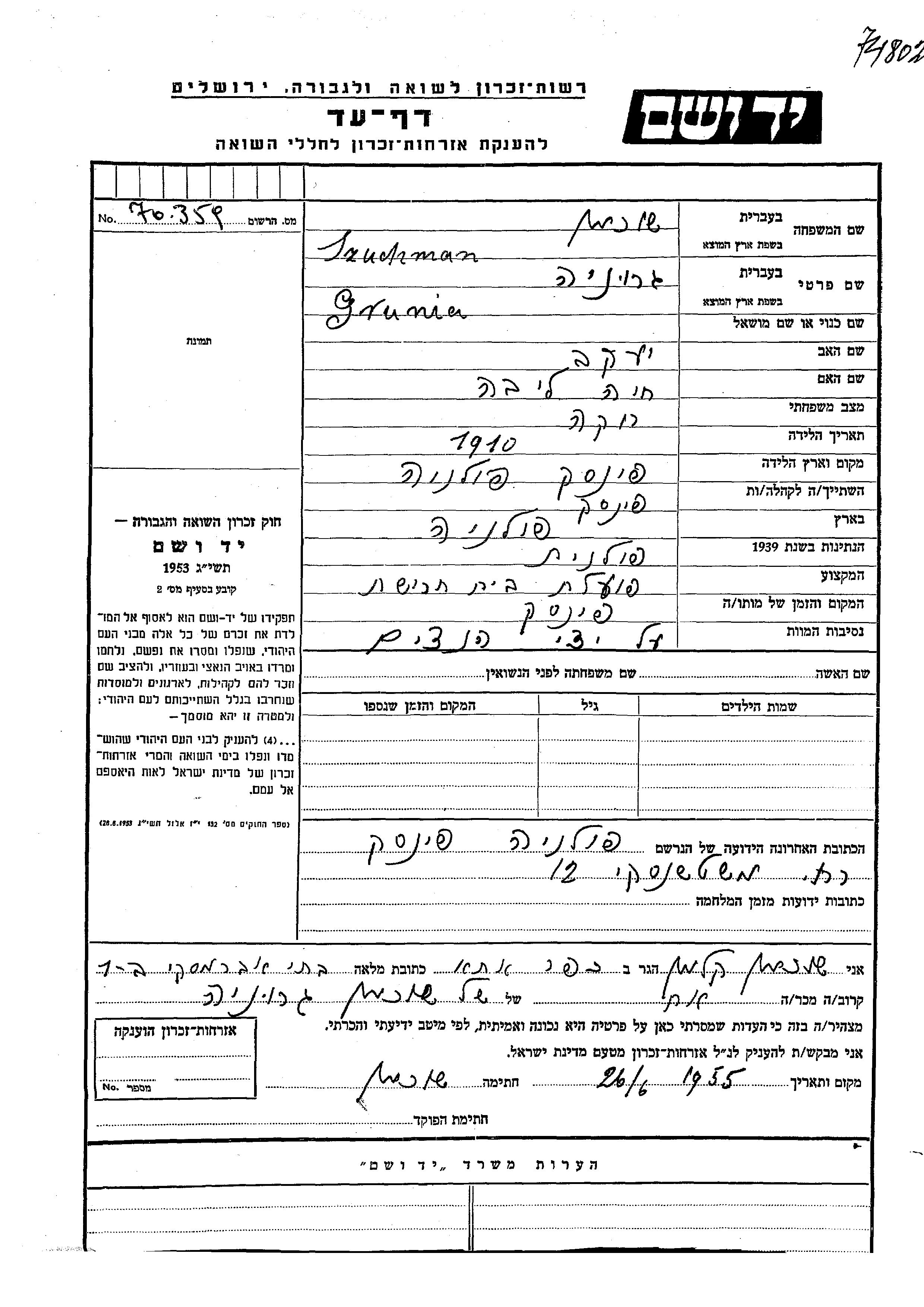Szuchman | Grunia | 1910 | Pinsk, Pologne | Feuille de témoignage |