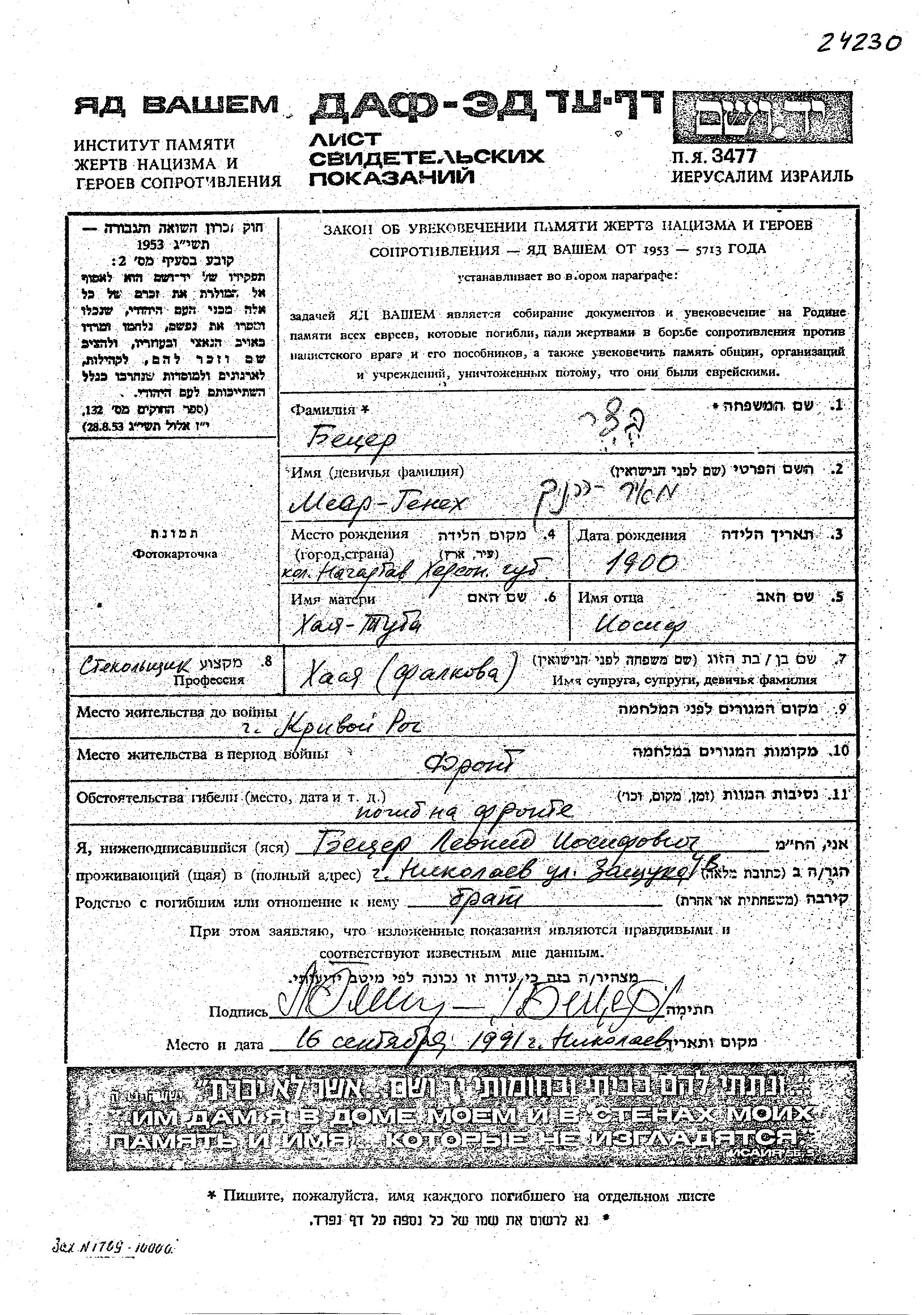 Meer Henekh Betzer est né à Nagartov, Ukraine (URSS) en 1900. Il était Vitrier. Avant la seconde guerre mondiale il vivait à Krivoy Rog, Ukraine (URSS).