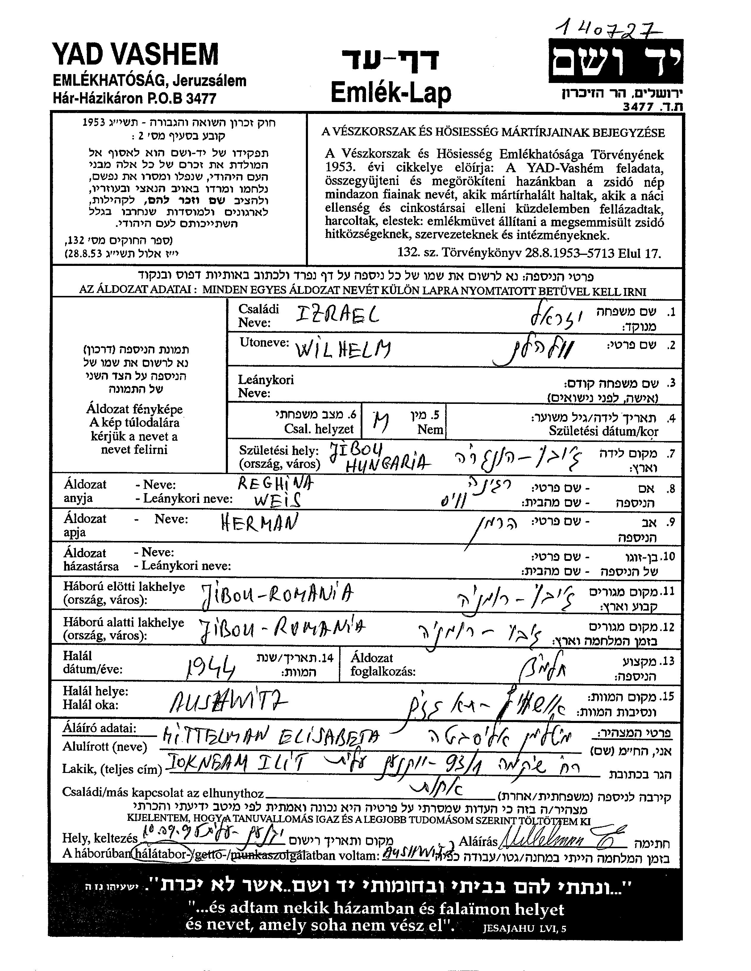 Izrael Wilhelm Jibou, Roumanie Feuille de témoignage