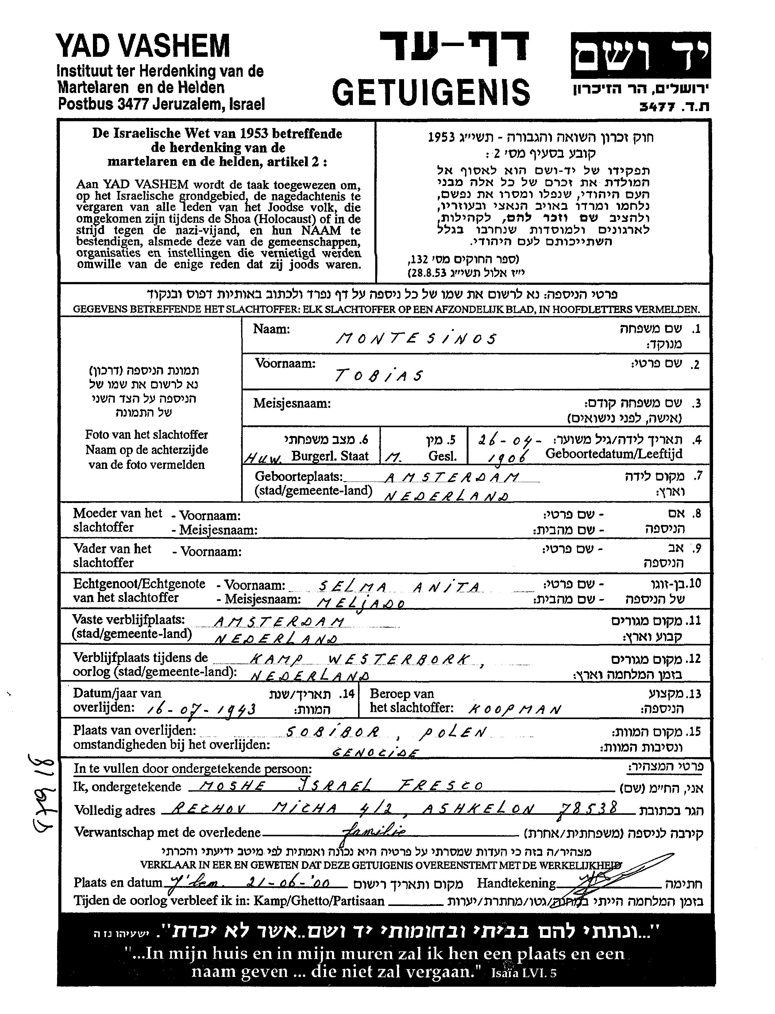 Montesinos | Tobias | 1906 | Amsterdam, Pays-Bas | Feuille de témoignage |