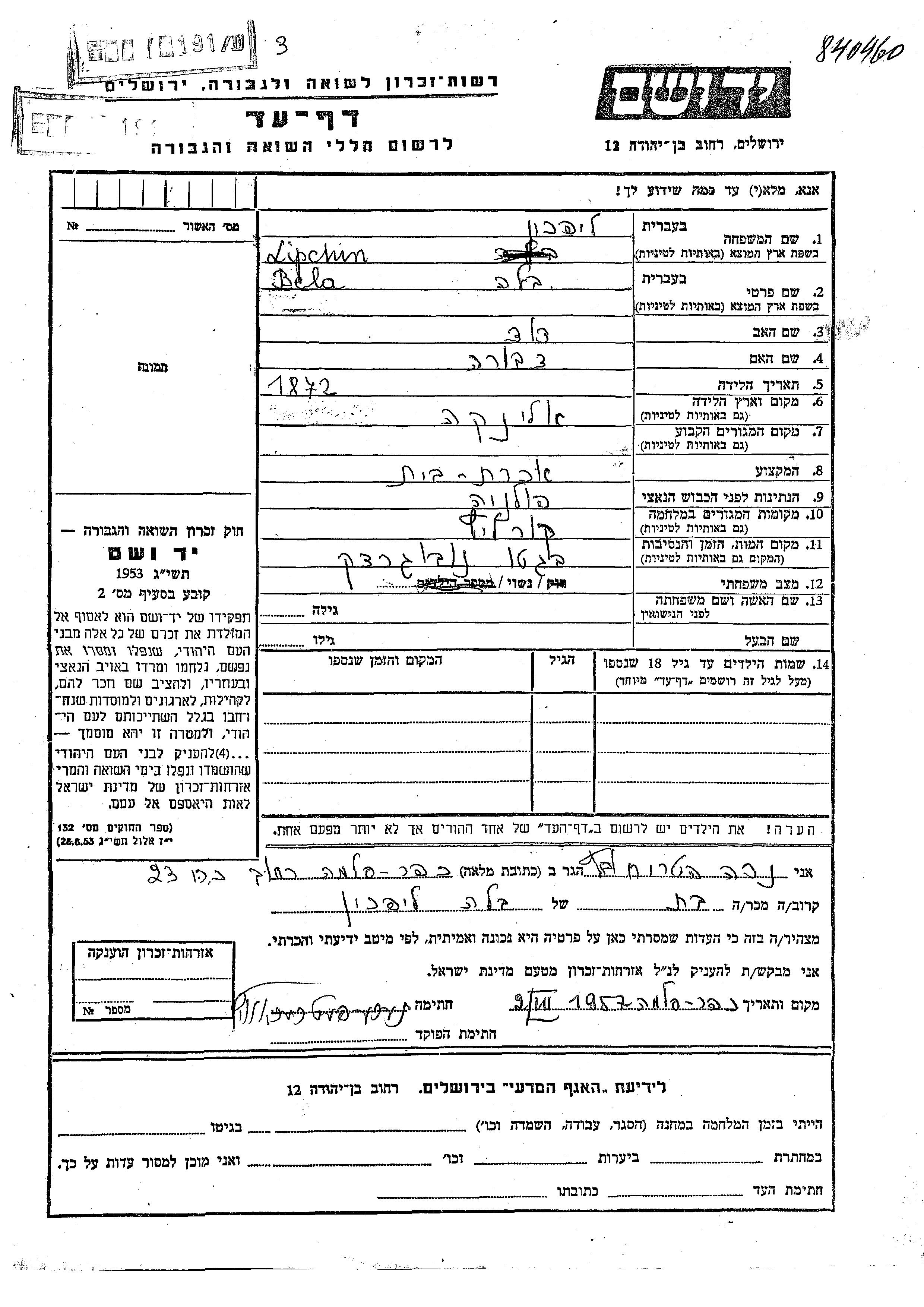 Lipchin Bela 1872 endroit inconnu, Feuille de témoignage