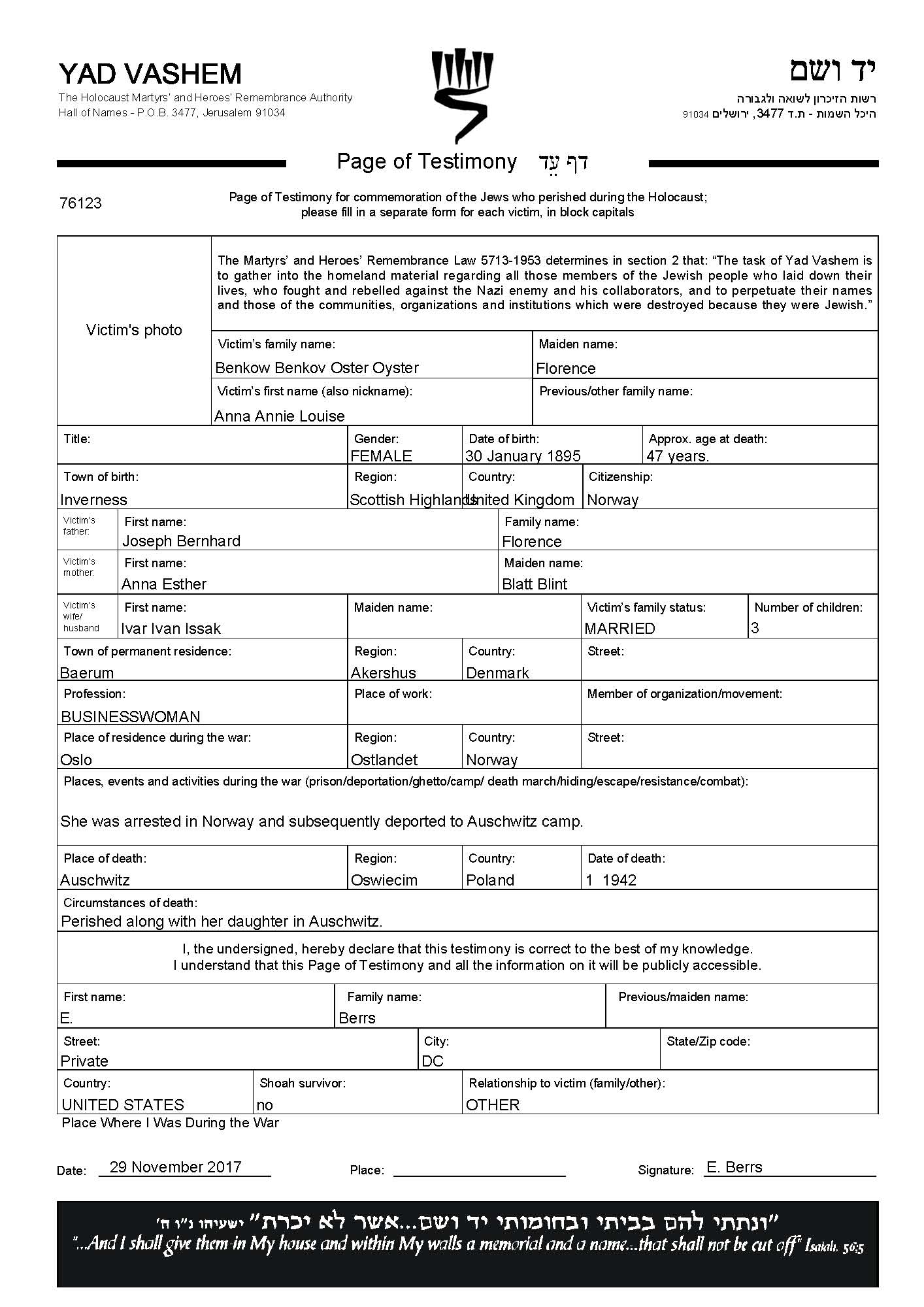Anne Louise Benkow Oster née Florence est née à Inverness, Great Britain en 1895. Elle était Propriétaire d'un magasin. Avant la seconde guerre mondiale elle vivait à Baerum, Norvège. Anne Louise a été assassinée pendant la Shoah. Lieu de la mort: Grodziszcze, Allemagne en 1942.