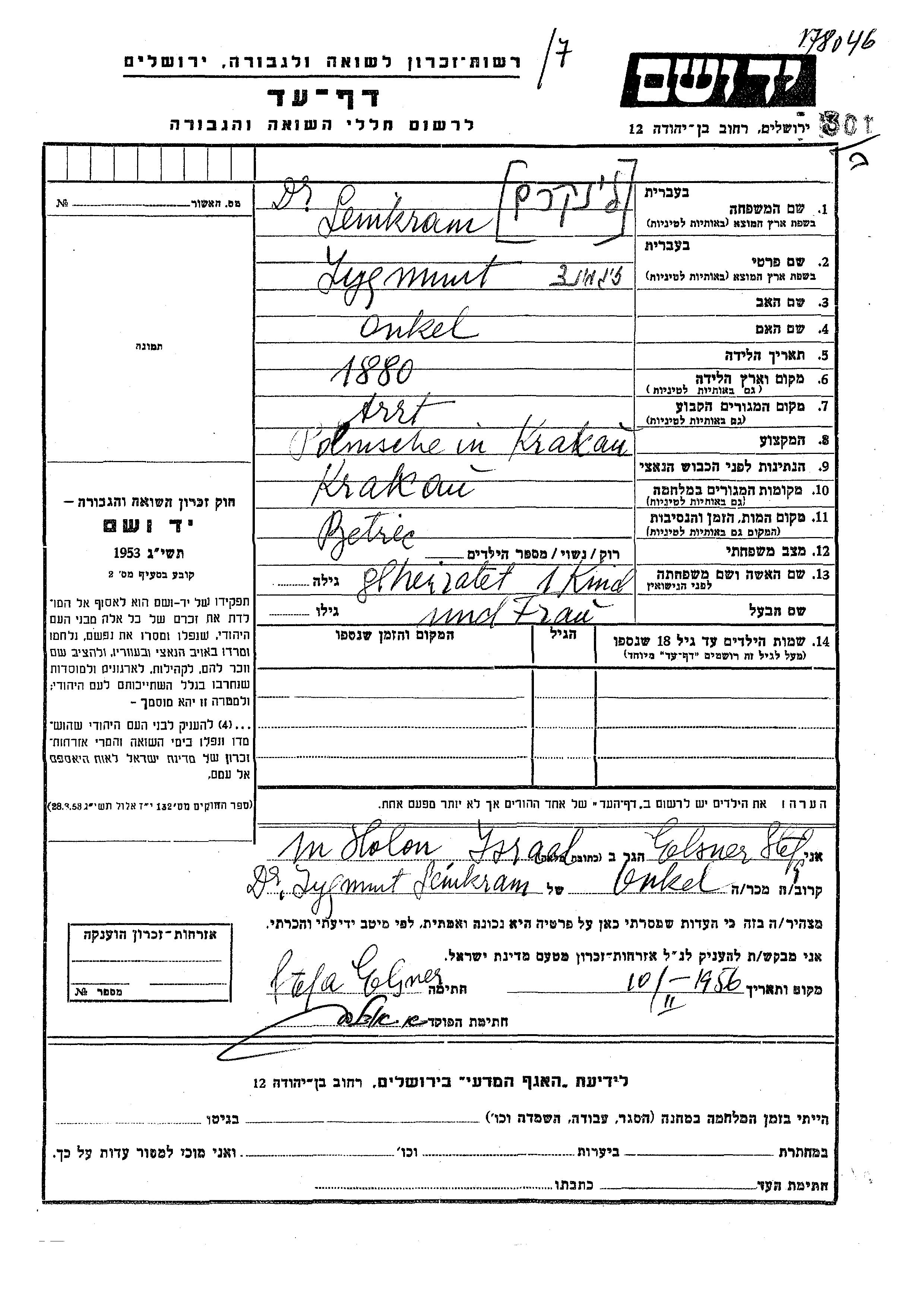 Dr. Zygmunt Leinkram est né en 1880. Il était Médecin et Marié. Au cours de la guerre, il était à Krakow, Pologne.