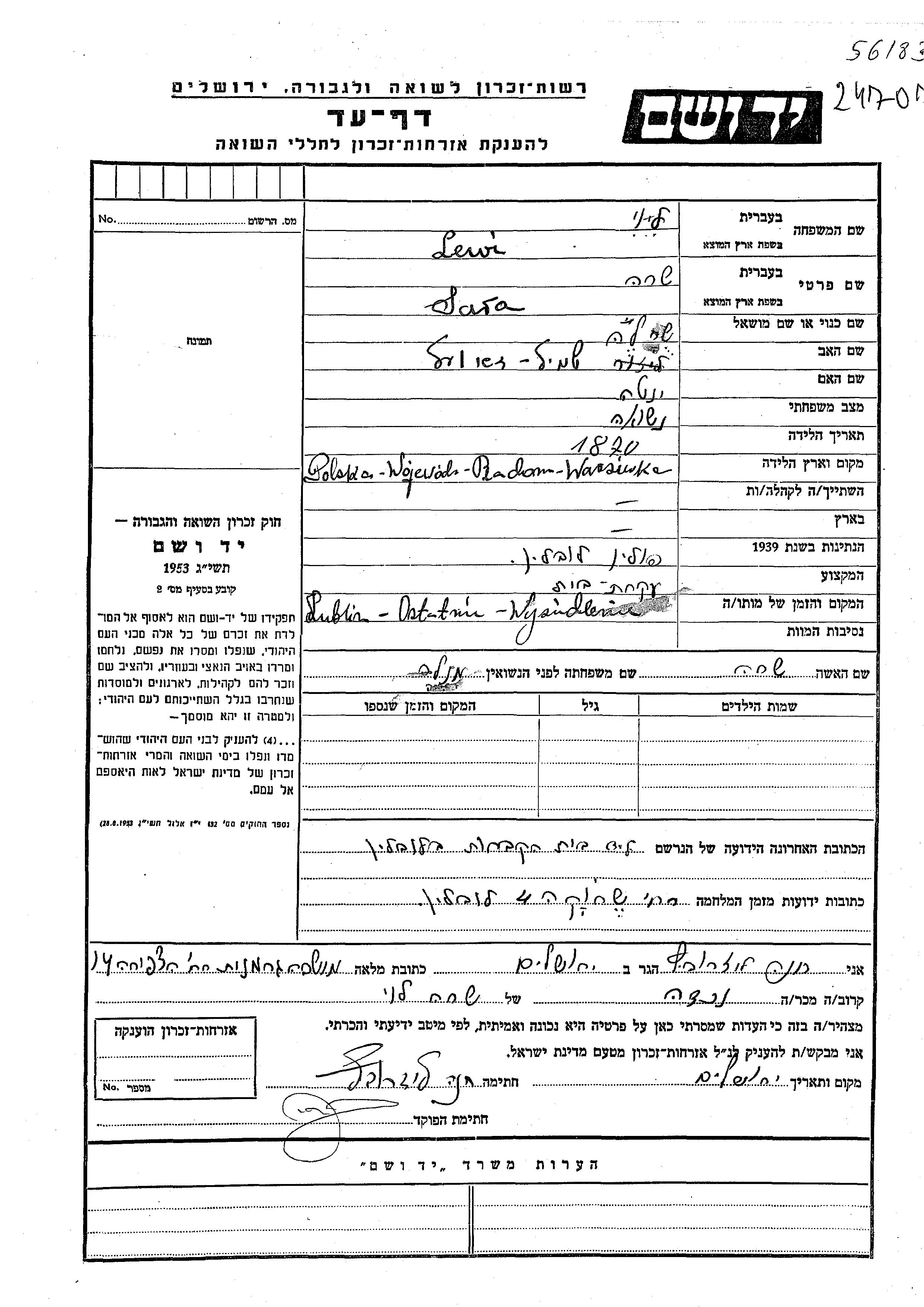 Sara Lewi née Manela est née à Radomin, Pologne en 1870, fille de Shmil et de Yenta. Elle était Femme au foyer. Pendant la guerre, elle était à Lublin, Pologne.
