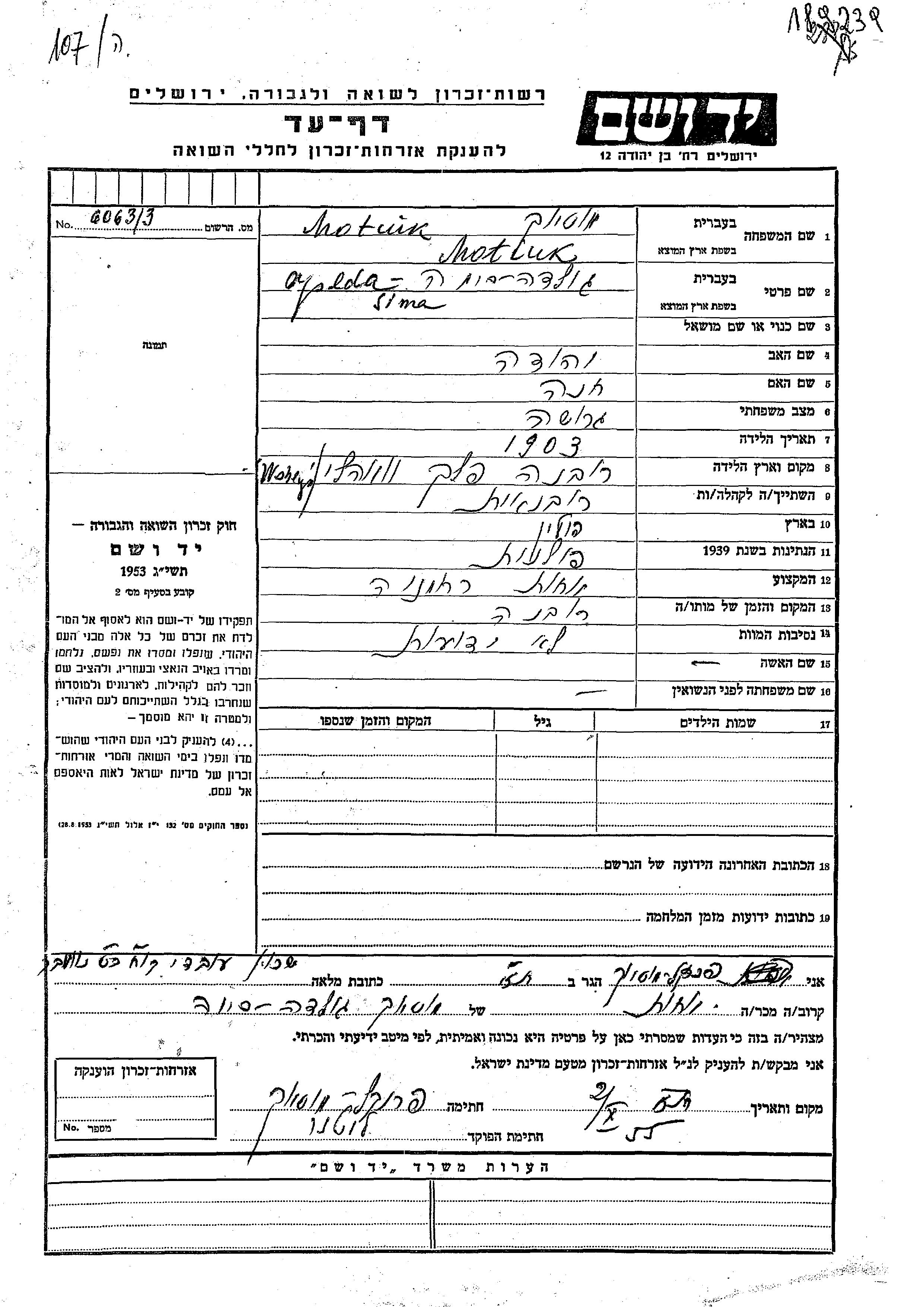 Motiuk Golda Sima 1903 endroit inconnu, Feuille de témoignage