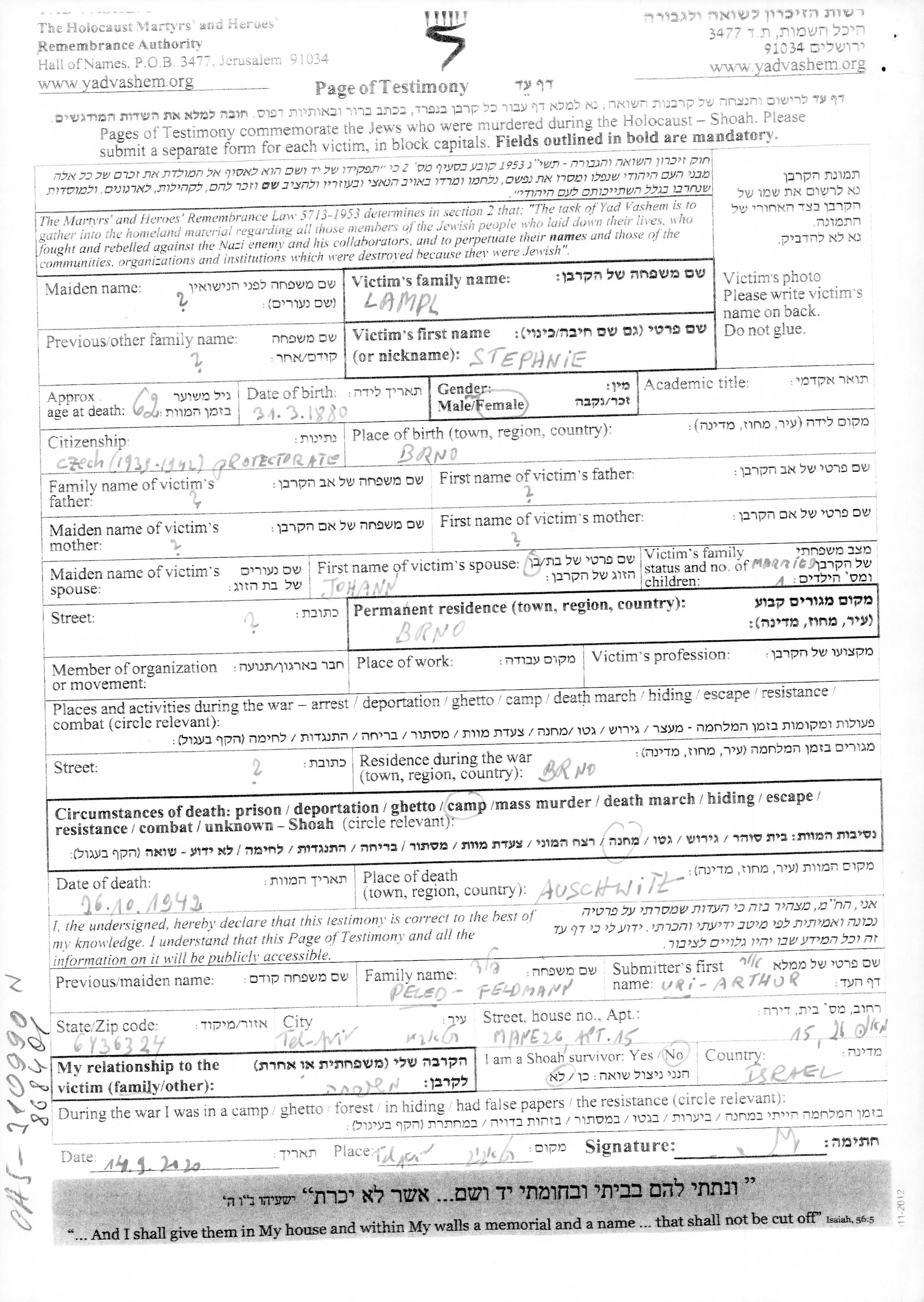 Lampl Stepanie 1880 Brno, Tchécoslovaquie Feuille de témoignage