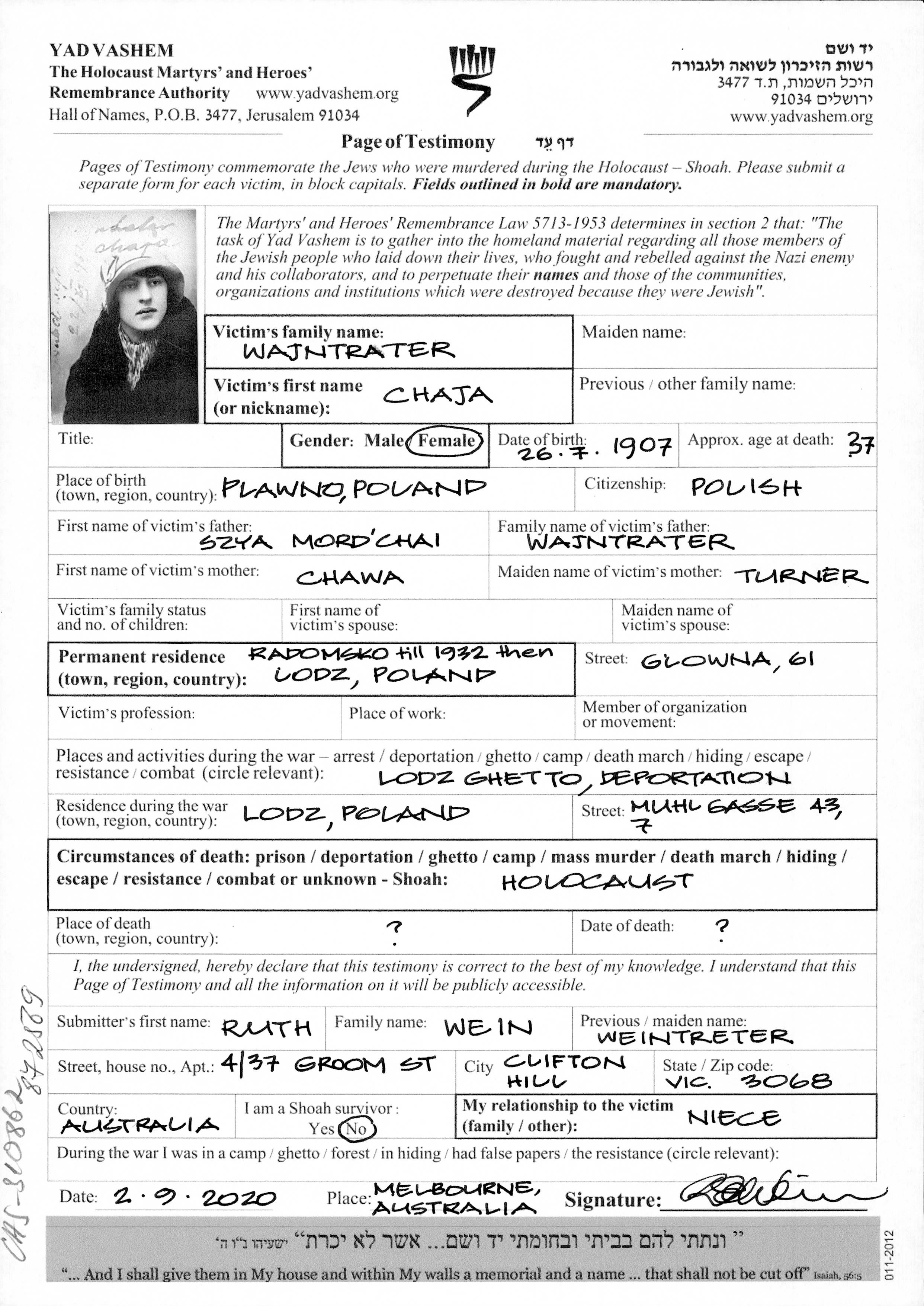 Wajntrater Chaja 1907 Radomsko, Pologne Feuille de témoignage