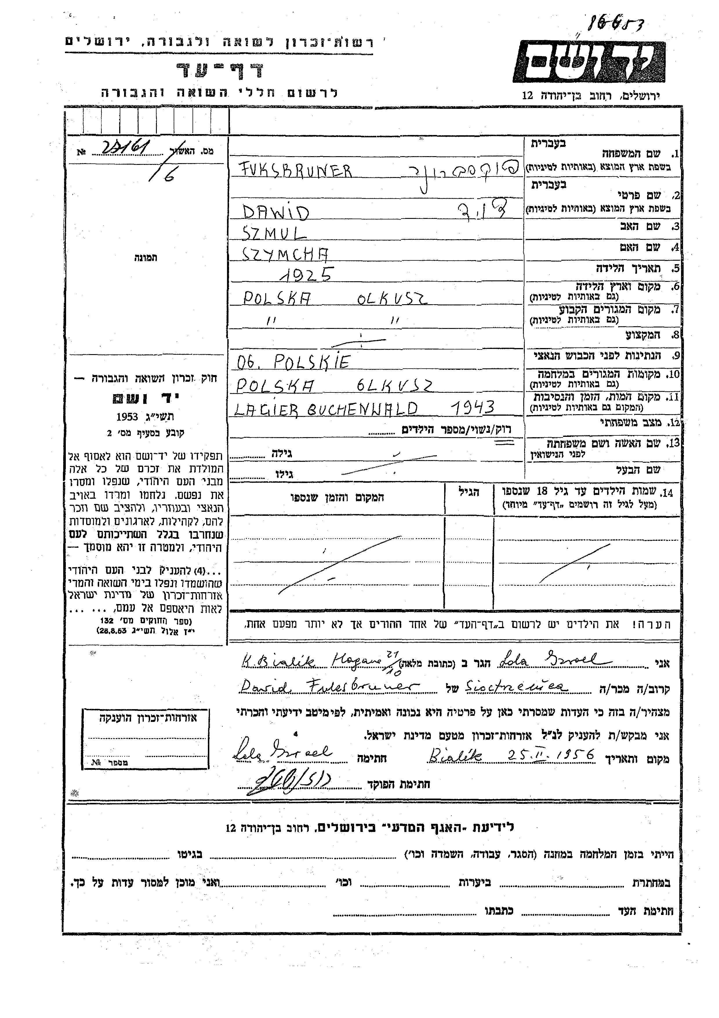 Dawid Fuksbruner est né à Olkusz, Pologne en 1925, fils de Szmul et de Szymcha. Il était Célibataire. Avant la seconde guerre mondiale il vivait à Olkusz, Pologne. Au cours de la guerre, il était à Olkusz, Pologne.