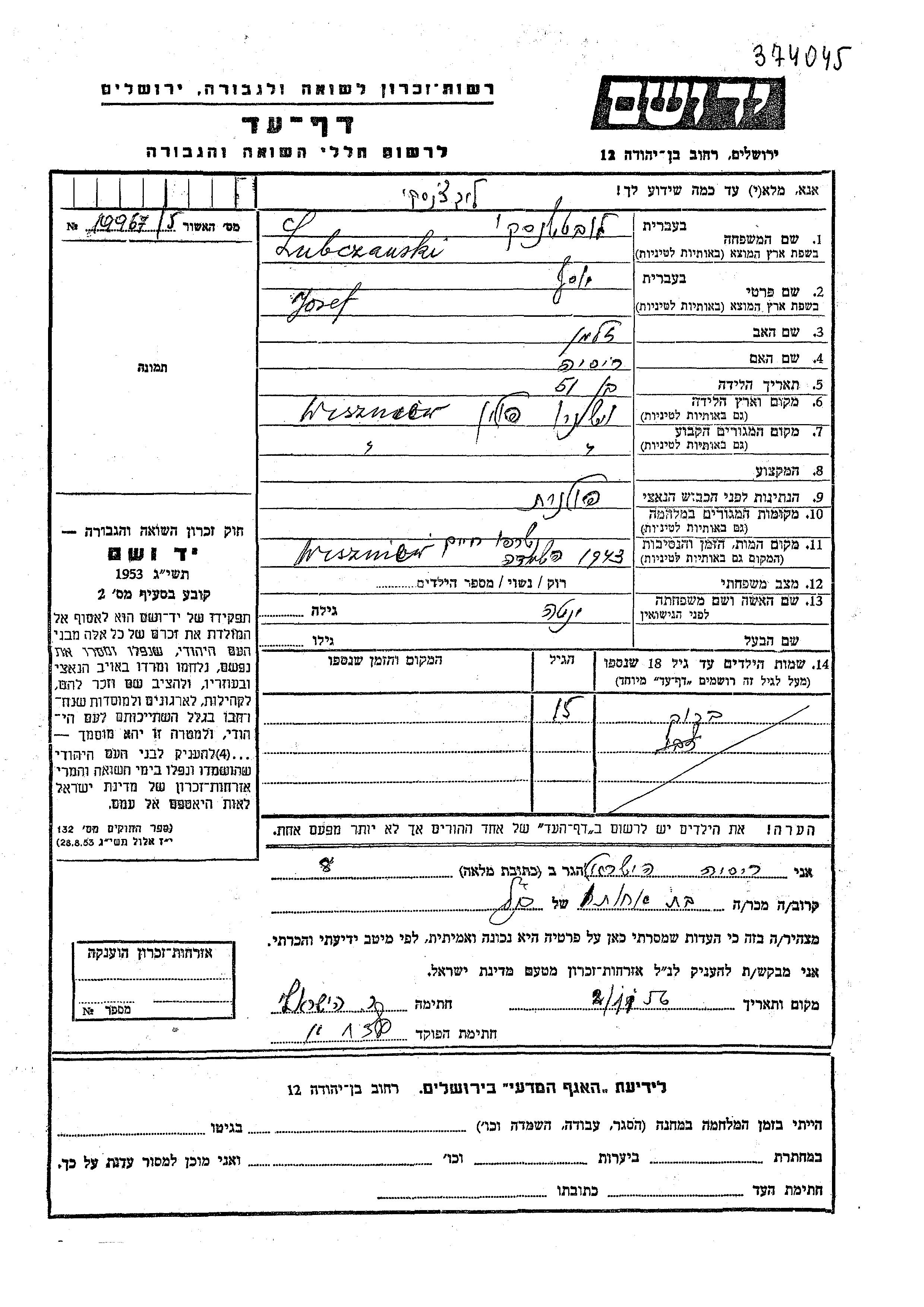 Lubczanski Josef Wiszniew, Pologne Feuille de témoignage