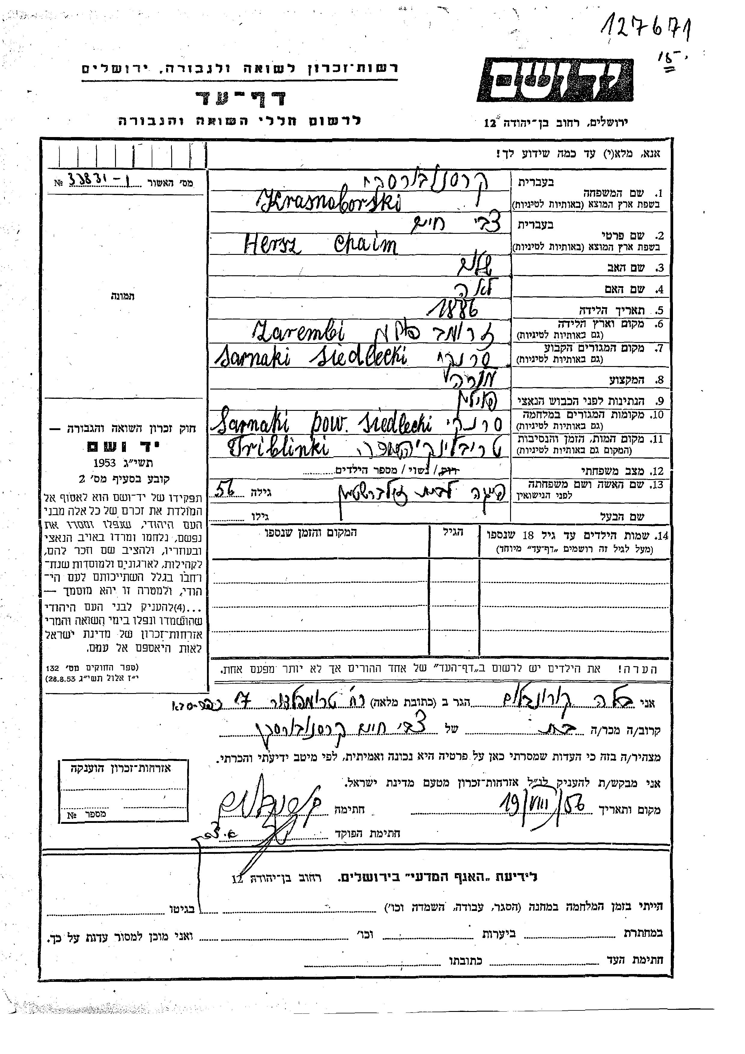 Krasnoborski Hersz Chaim Tzvi 1886 Sarnaki, Pologne Feuille de témoignage