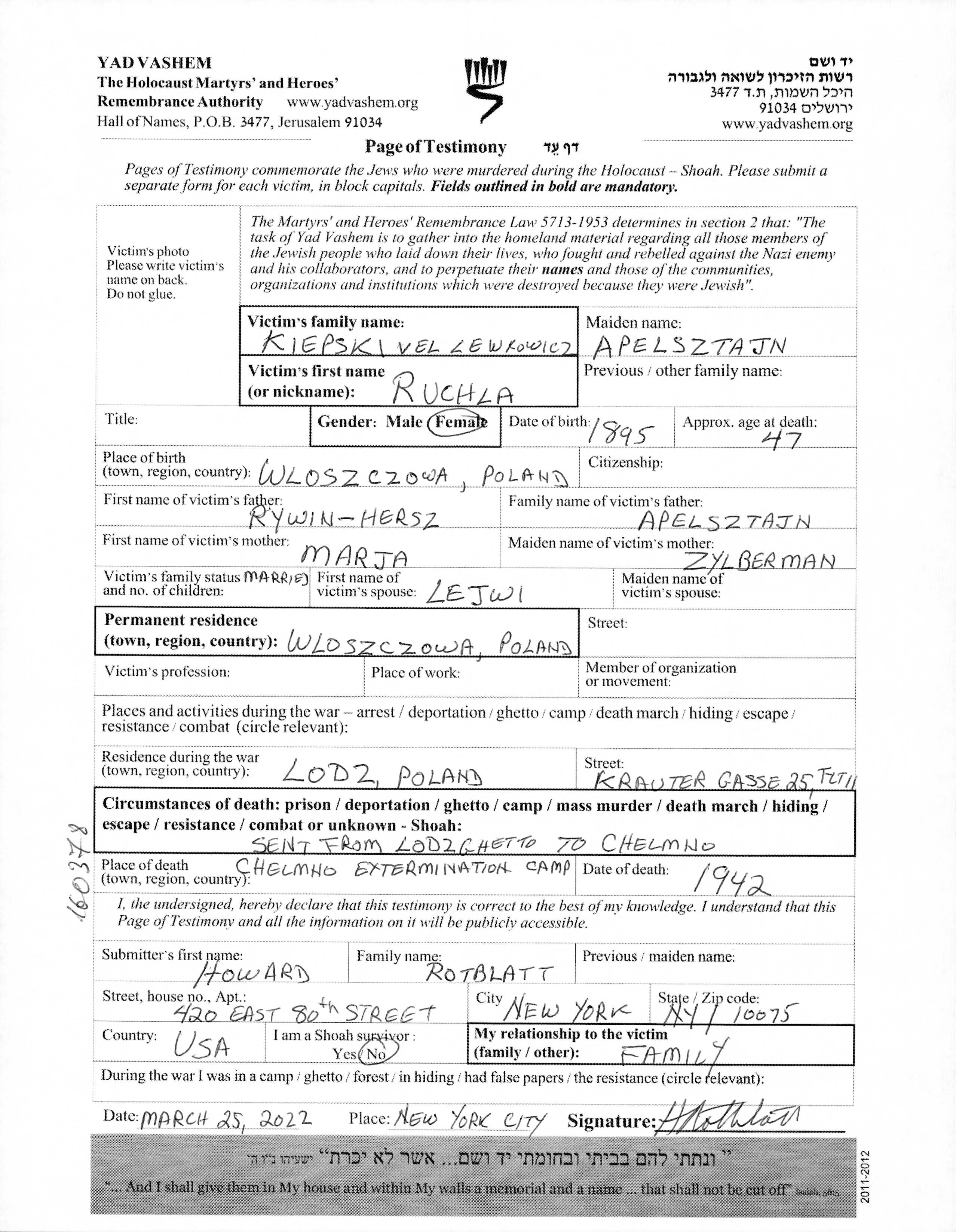 Kiepski Lewkowicz Ruchla 1895 Wloclawek, Pologne Feuille de témoignage
