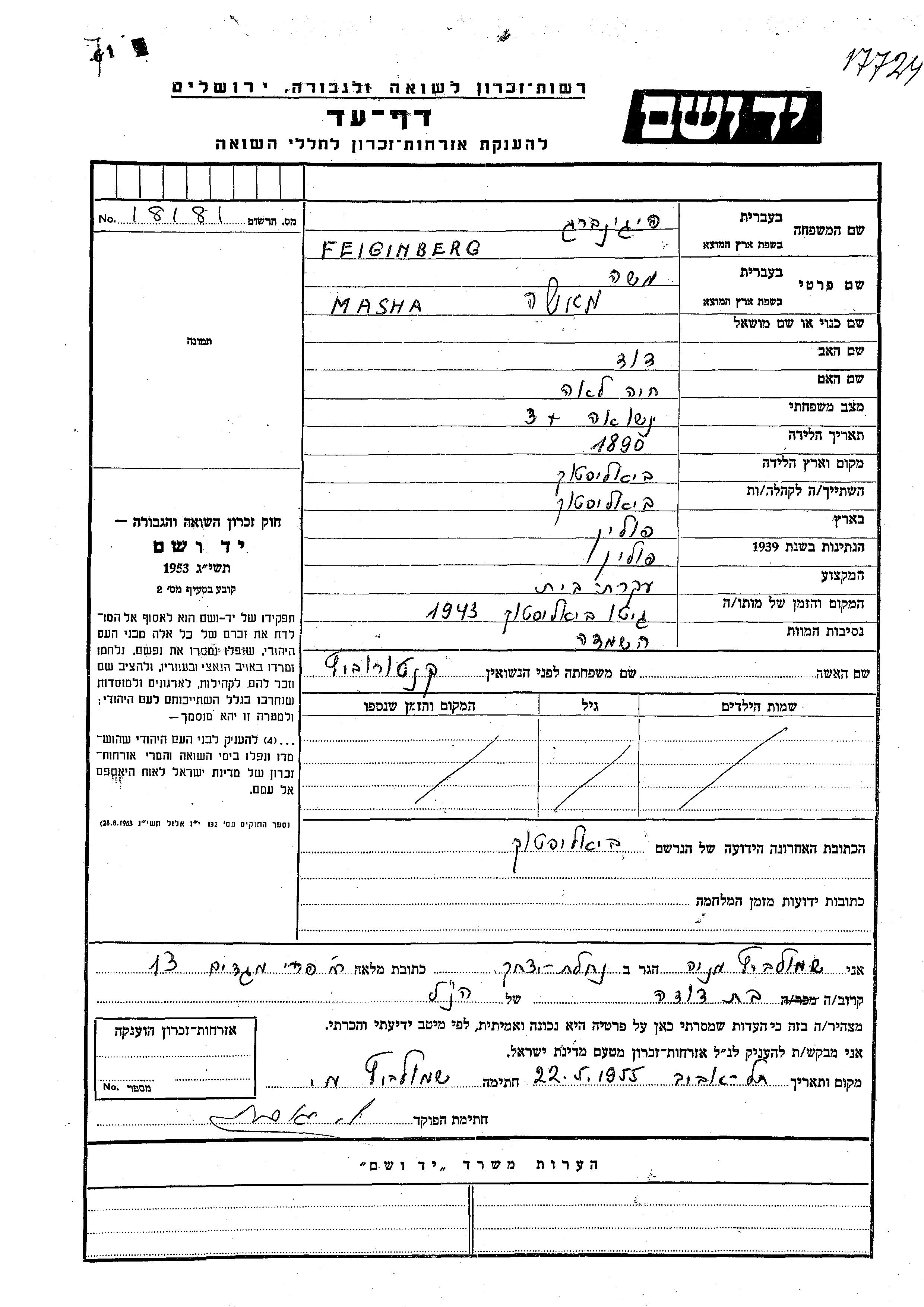 Feiginberg Masha Moshe 1890 Bialystok, Pologne Feuille de témoignage