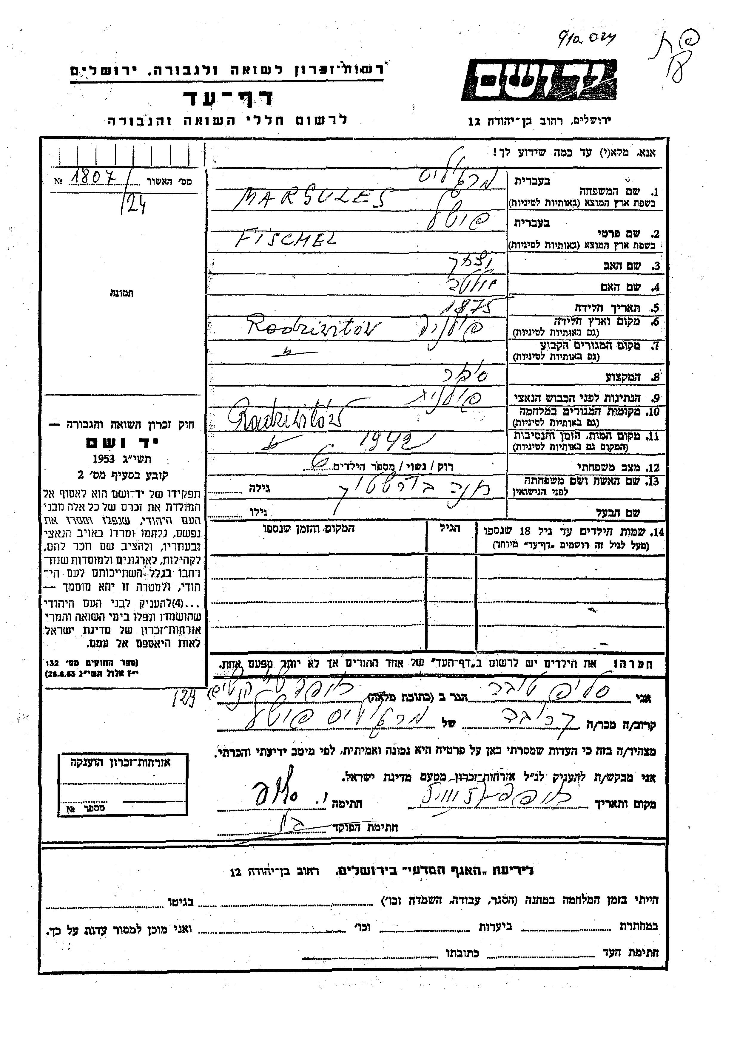 Yad Vashem - Pages of Testimony Names Memorial Collection