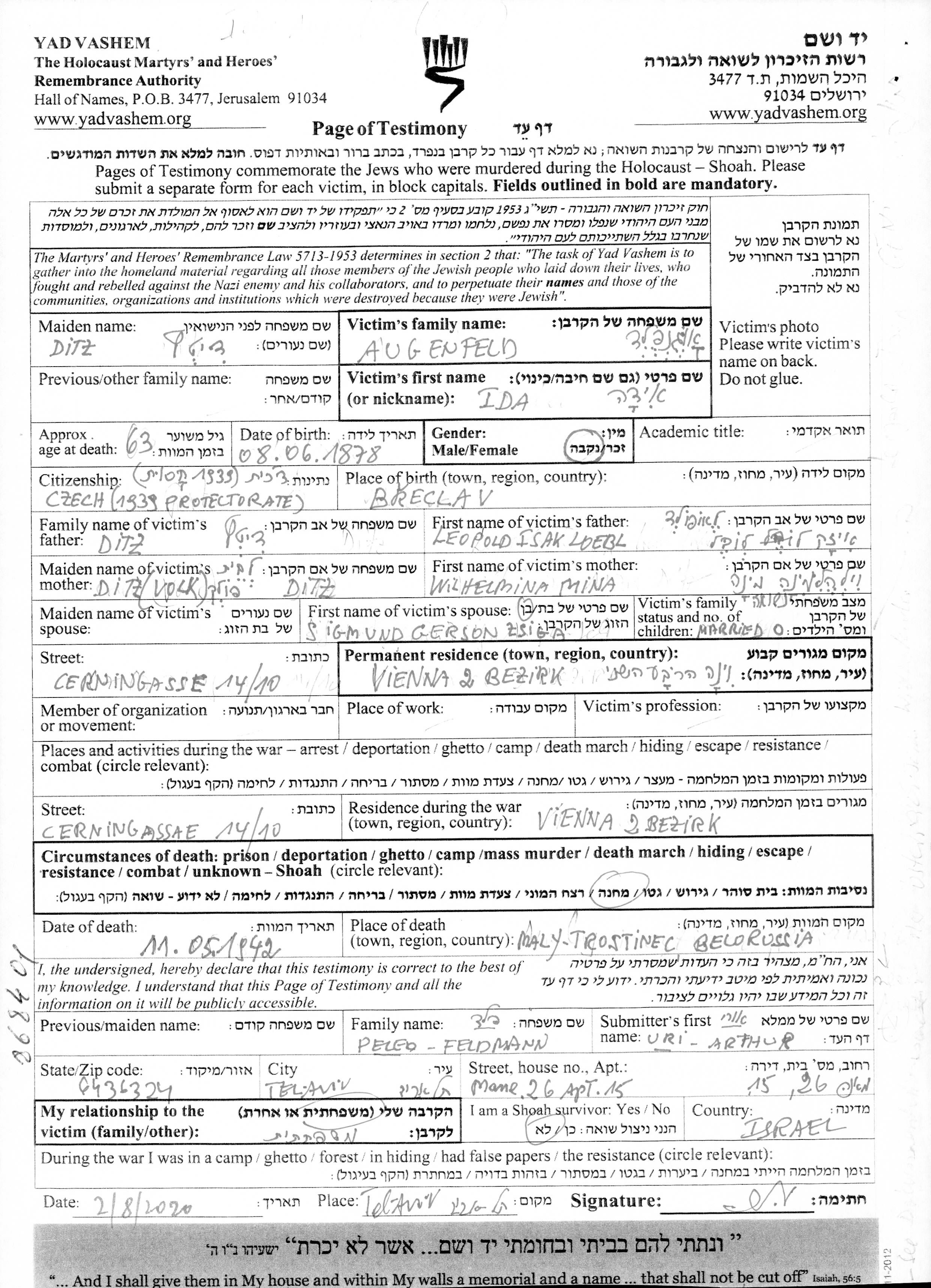 Augenfeld | Ida | 1878 | Wien, Autriche | Feuille de témoignage |