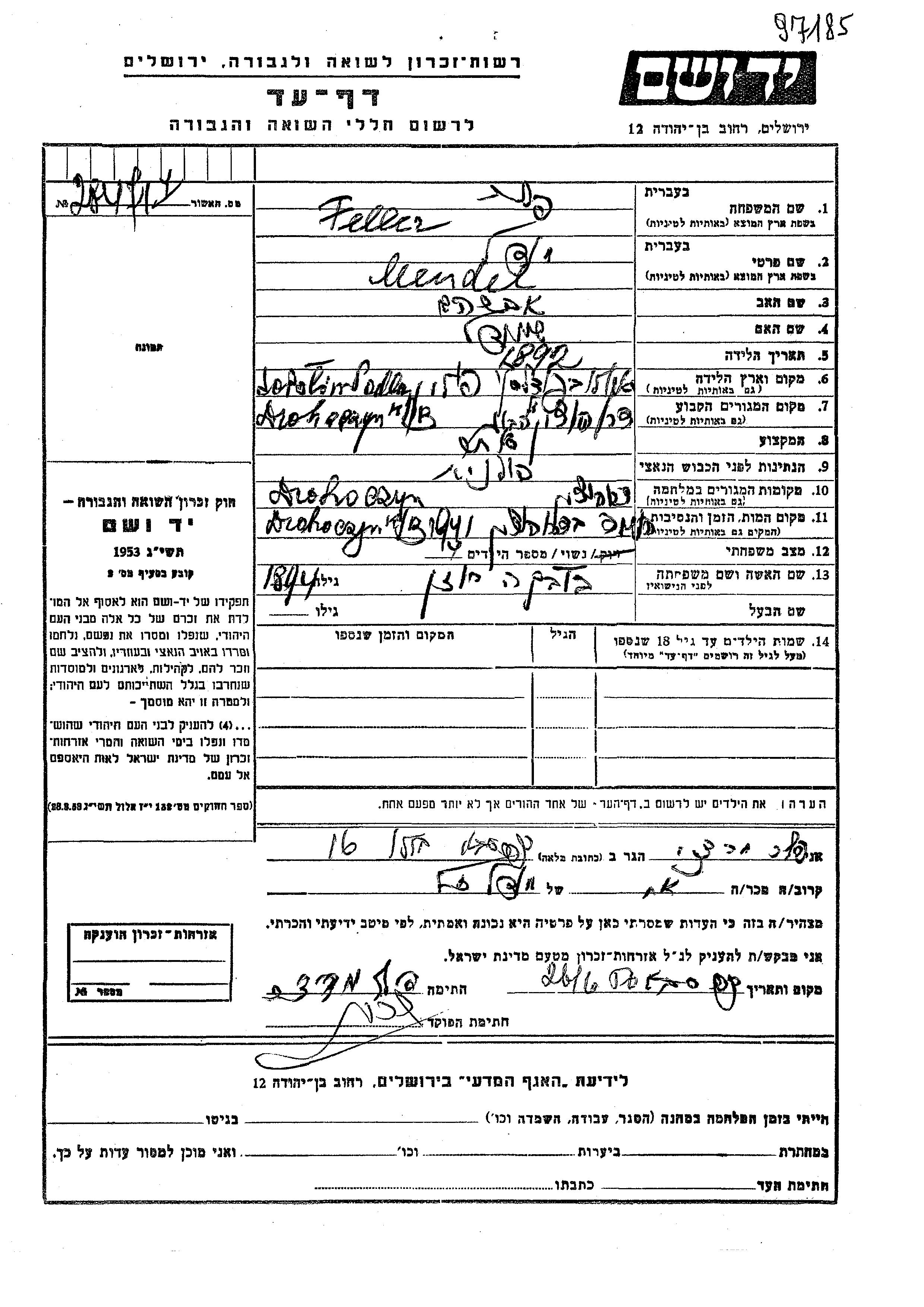 Feller Mendel 1892 Drohoczyn, Pologne Feuille de témoignage