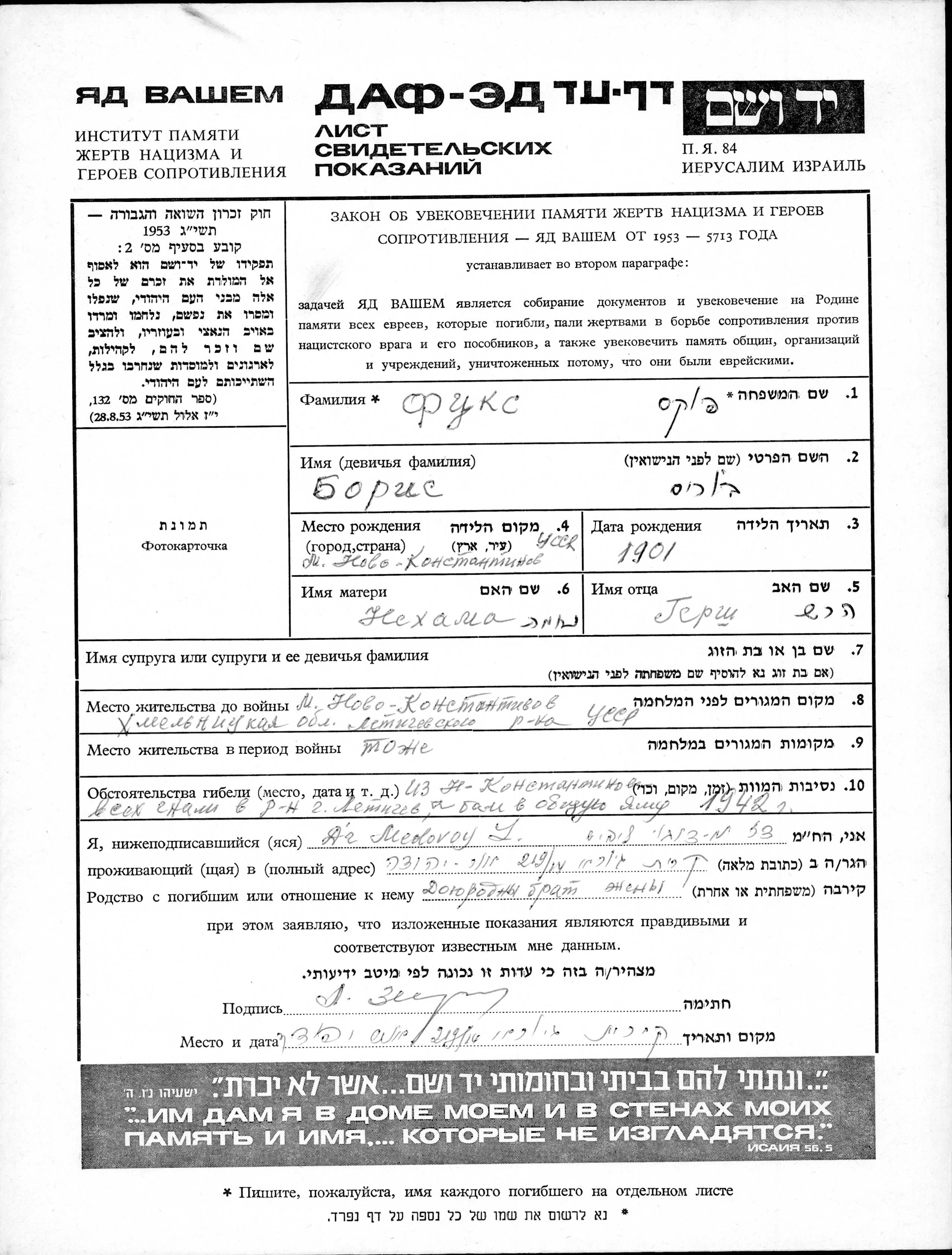 Fuks Boris 1901 Novo Konstantinov, Ukraine (URSS) Feuille de témoignage
