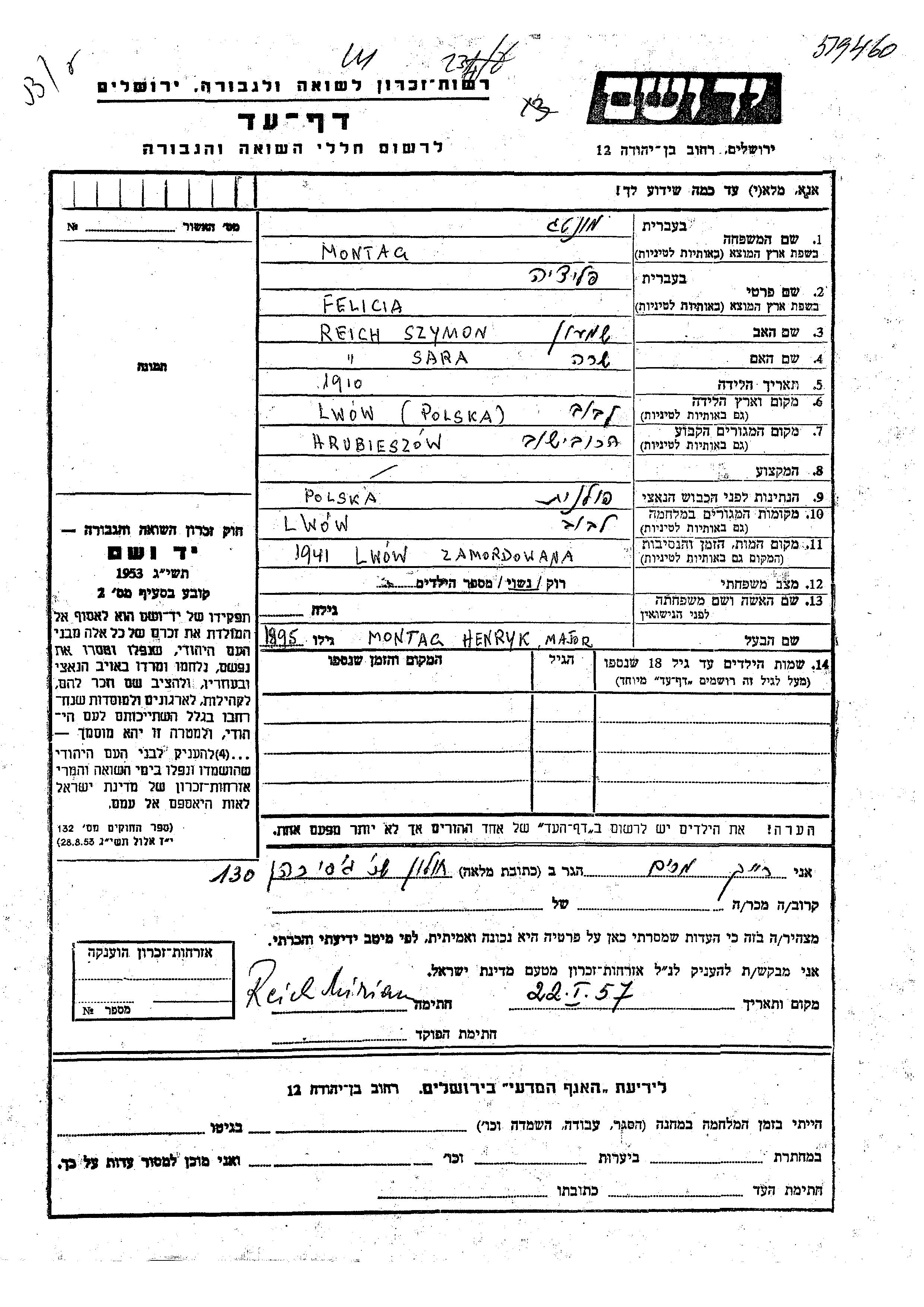 Montag Felicia 1910 Hrubieszow, Pologne Feuille de témoignage