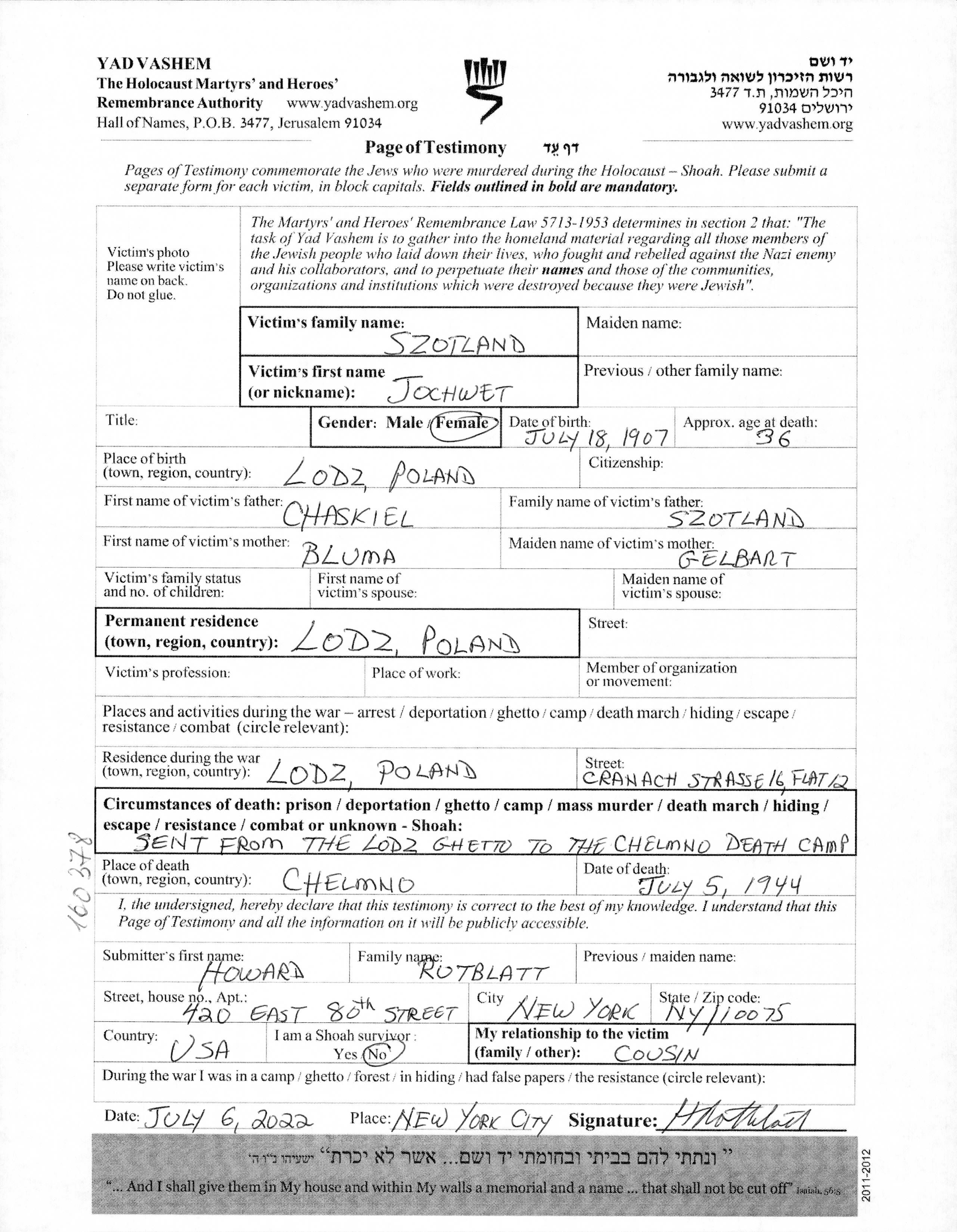 Jochwet Szotland est née à Lodz, Pologne en 1907, fille de Chaskiel et de Bluma née Gelbart. Avant la seconde guerre mondiale elle vivait à Lodz, Pologne. Pendant la guerre, elle était à Chelmno, Pologne.