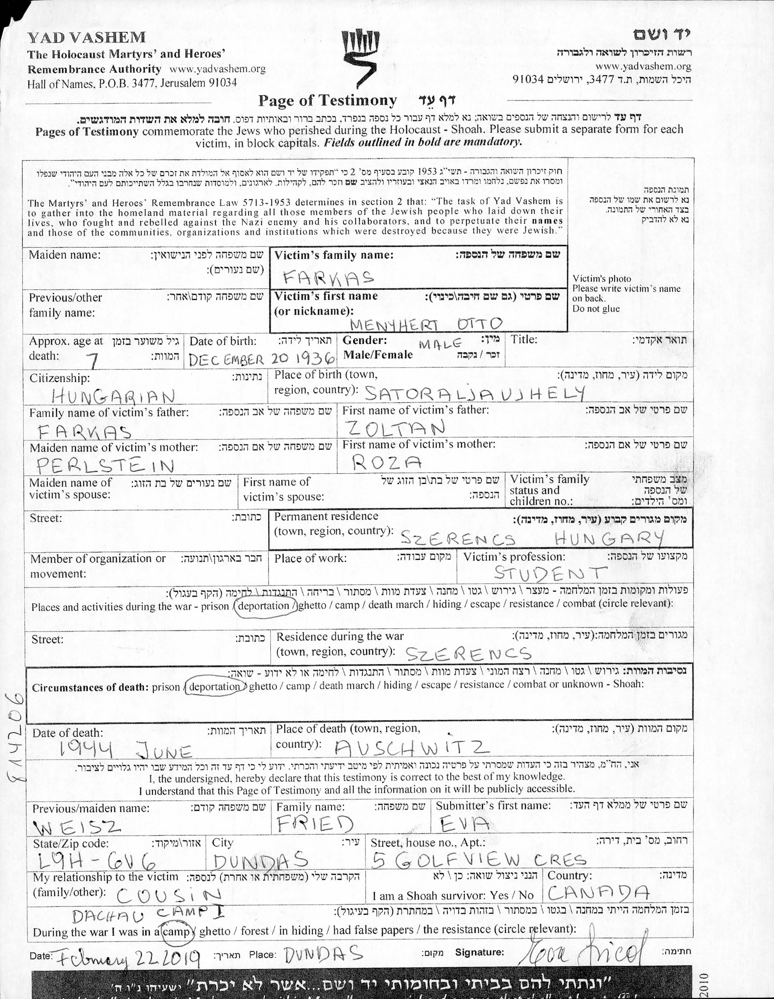 Farkas Menyhert 1936 Szerencs, Hongrie Liste des Juifs de Hongrie assassinés