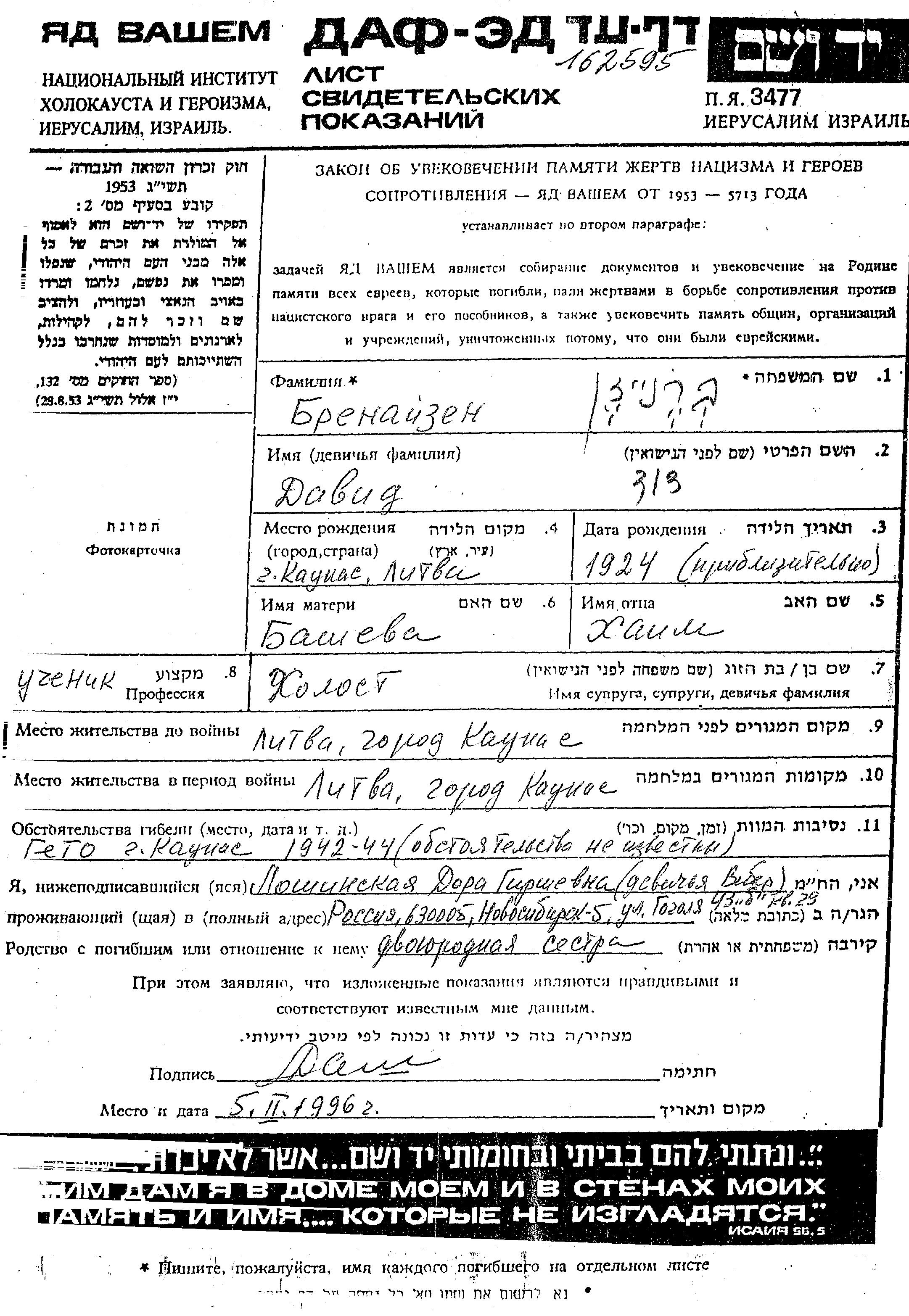 | Brenaizen | David | 1924 | Kaunas, Lituanie | Feuille de témoignage |