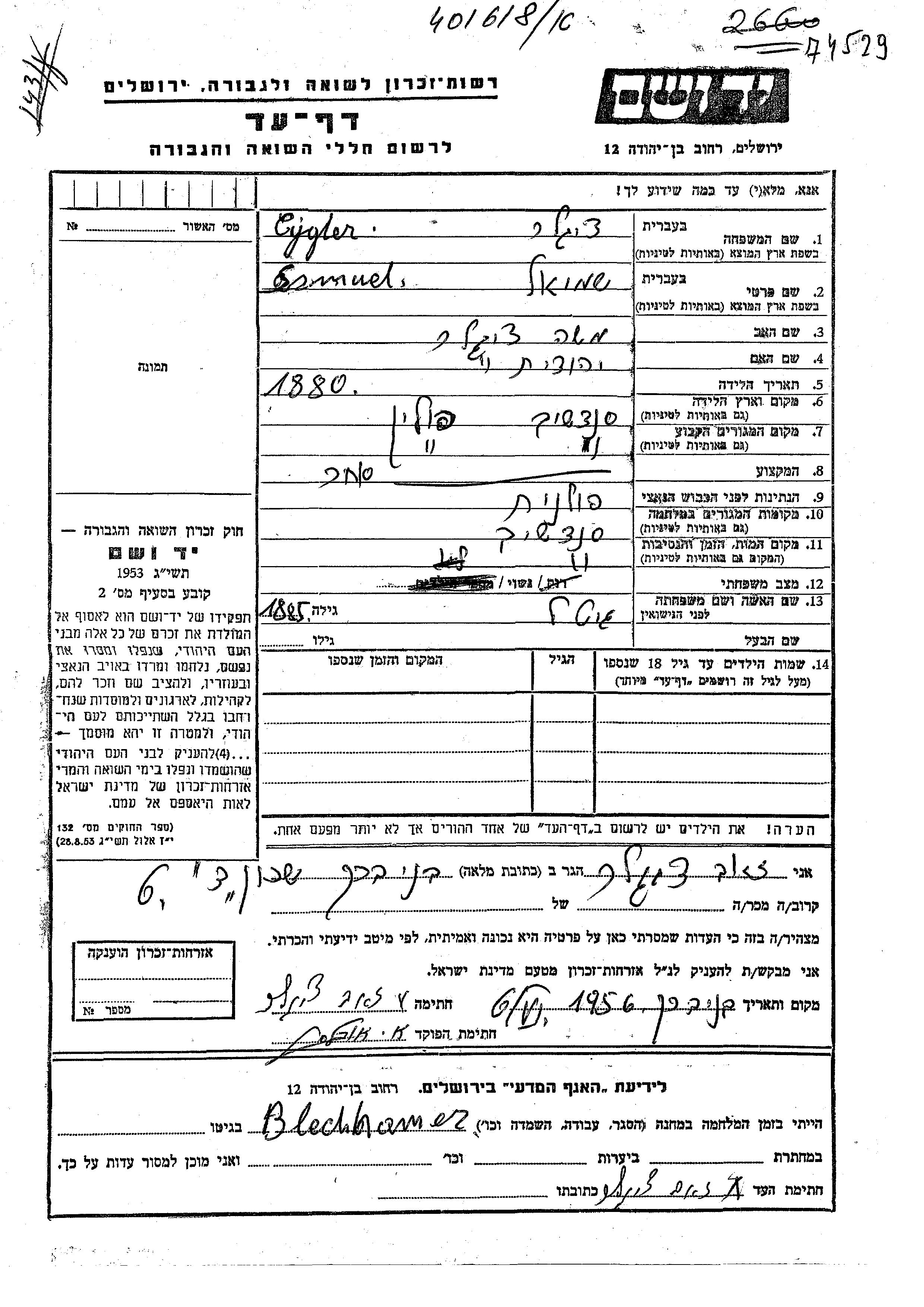 Cigler Szmuel 1880 Sedziszow, Pologne Feuille de témoignage