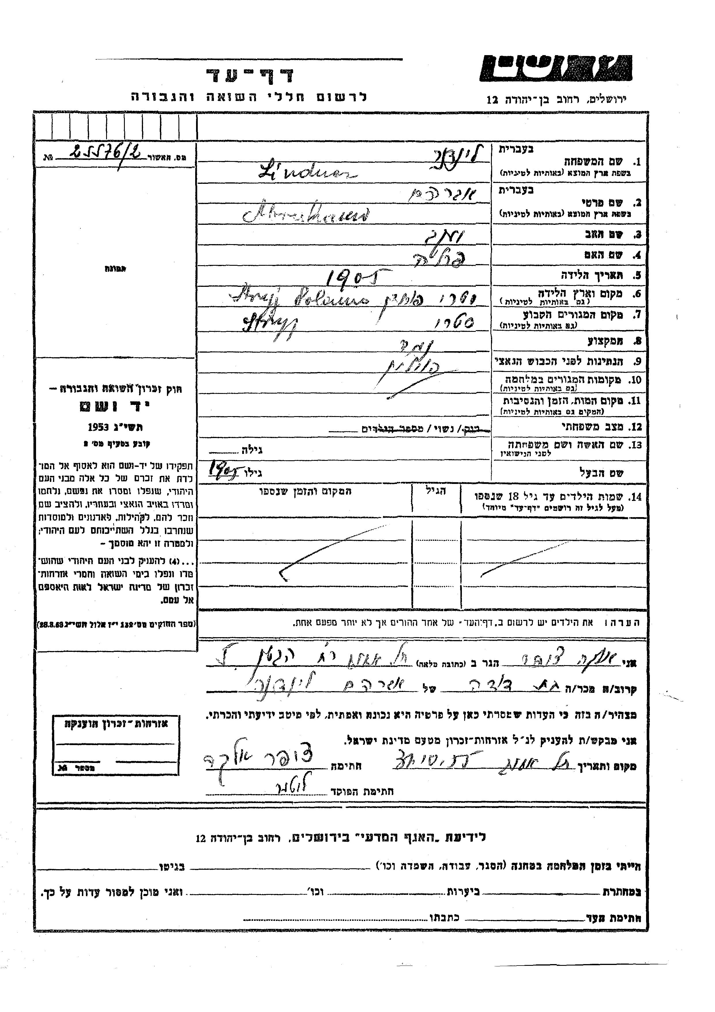 Lindner Abraham 1905 Stryj, Pologne Feuille de témoignage