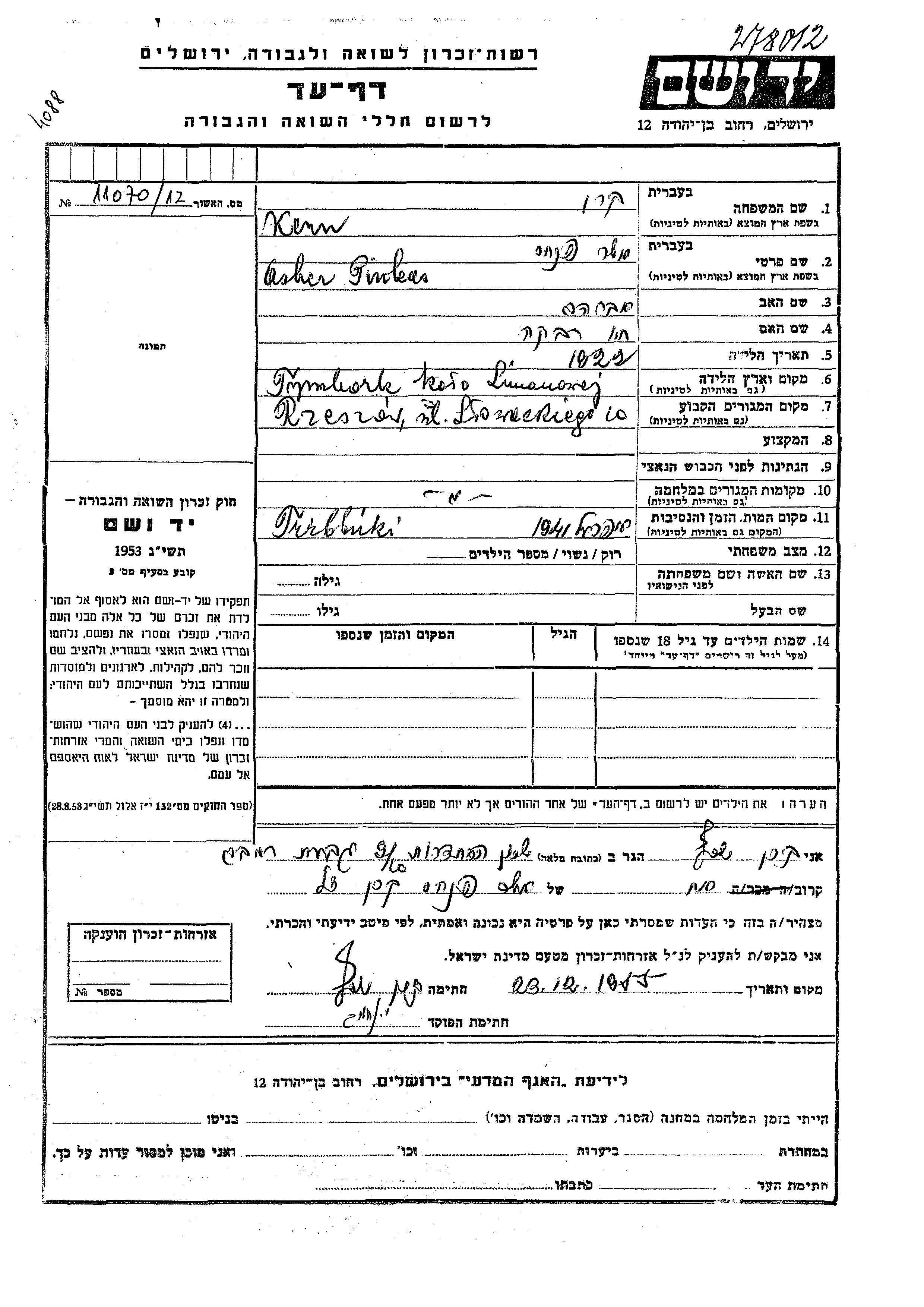 Kern Pinhas Asher 1922 Rzeszow, Pologne Feuille de témoignage