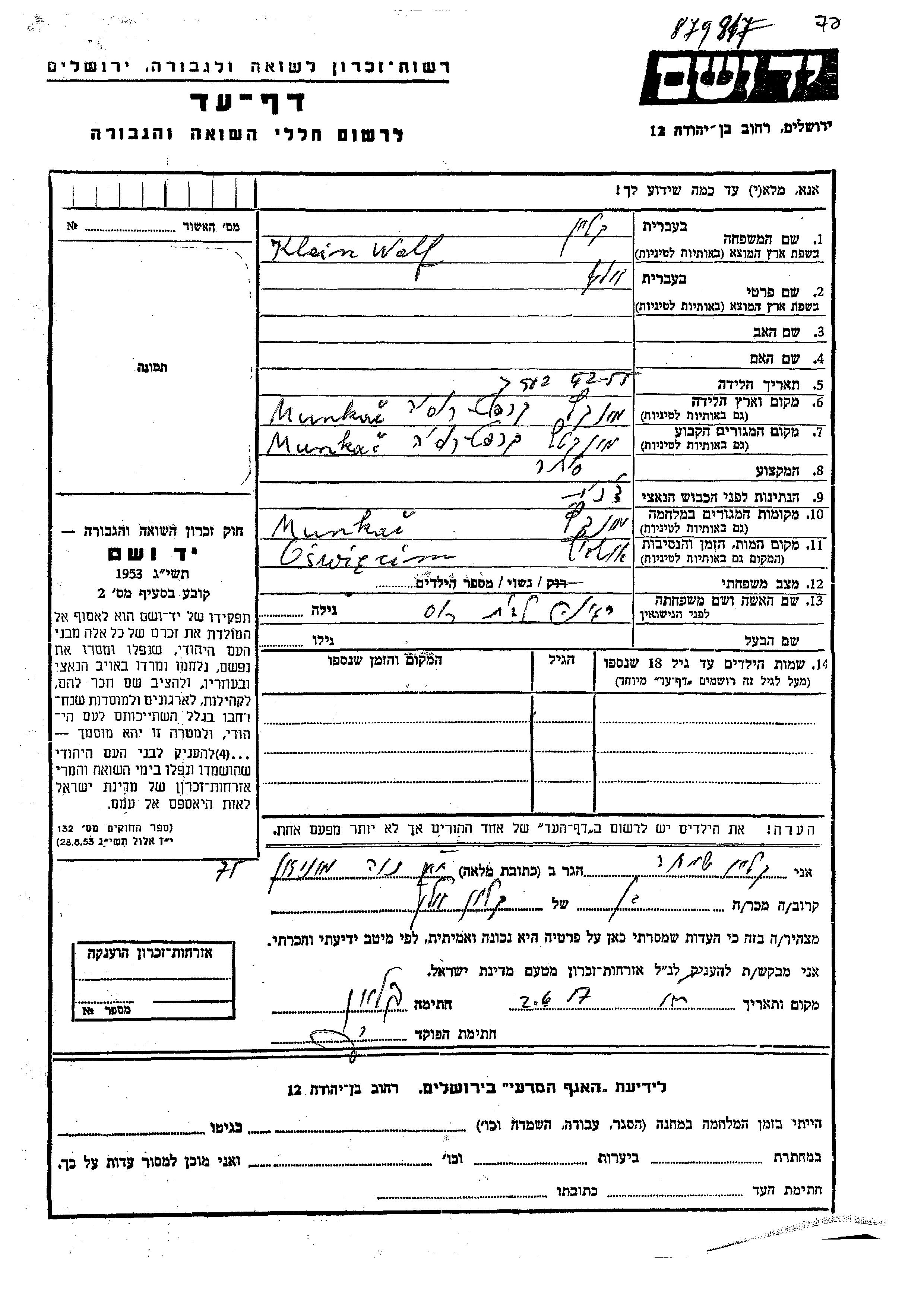 Klein Wolf Munkacs, Tchécoslovaquie Feuille de témoignage