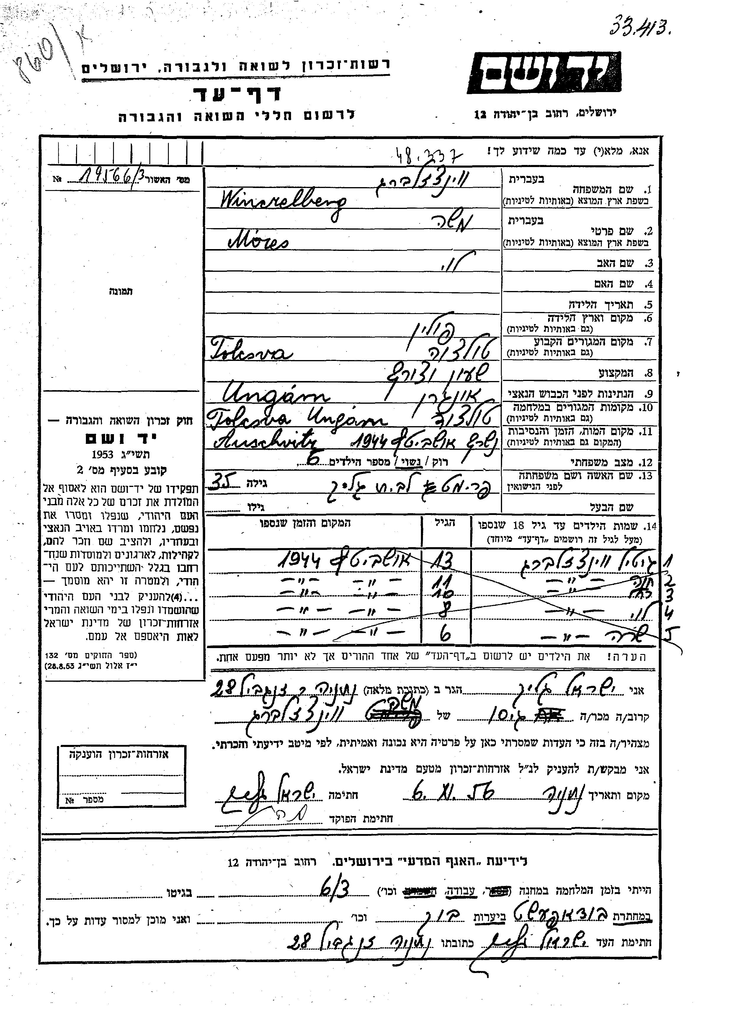 Winczelberg Moshe Tolcsva, Hongrie Feuille de témoignage