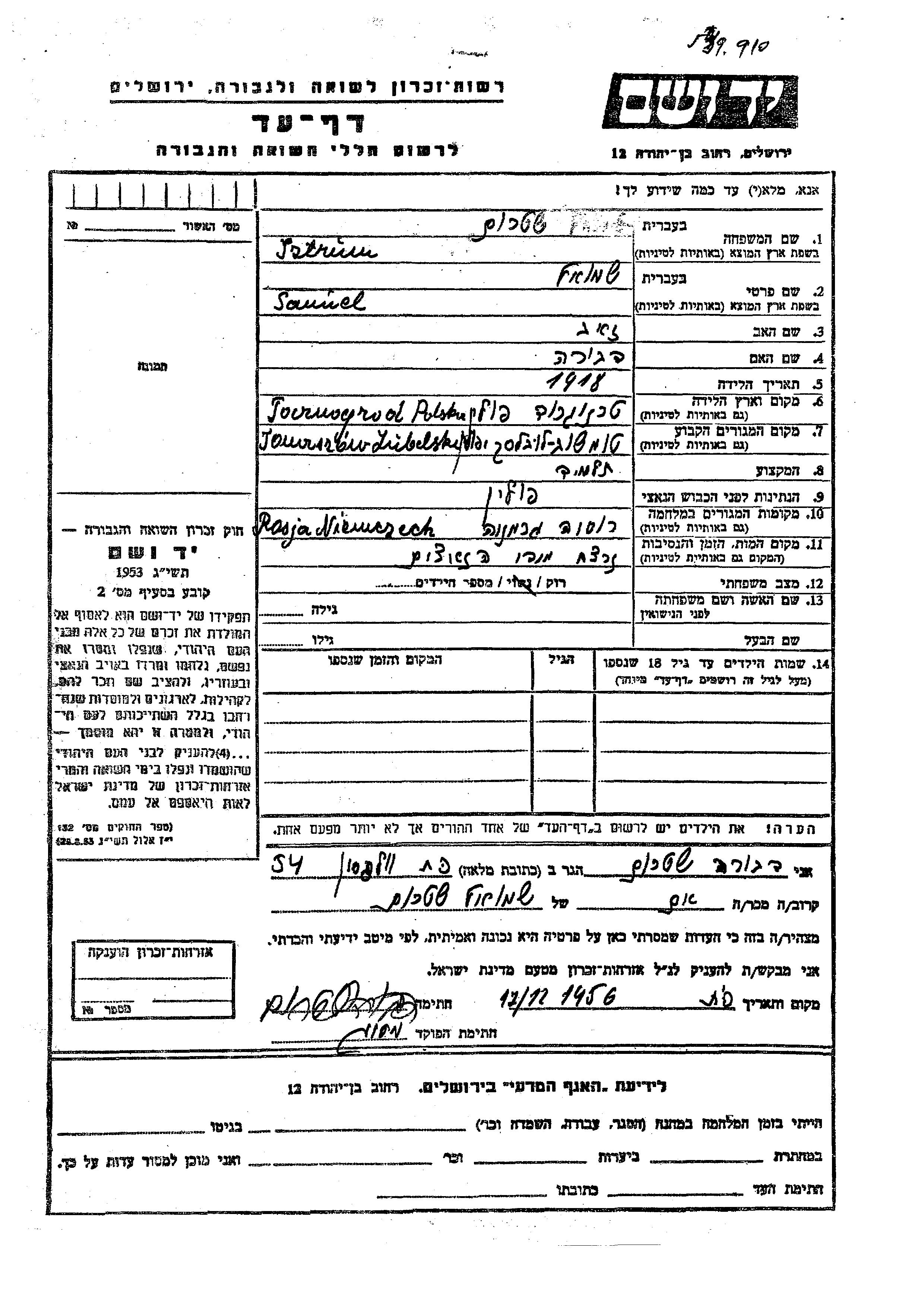 Yad Vashem - Pages of Testimony Names Memorial Collection