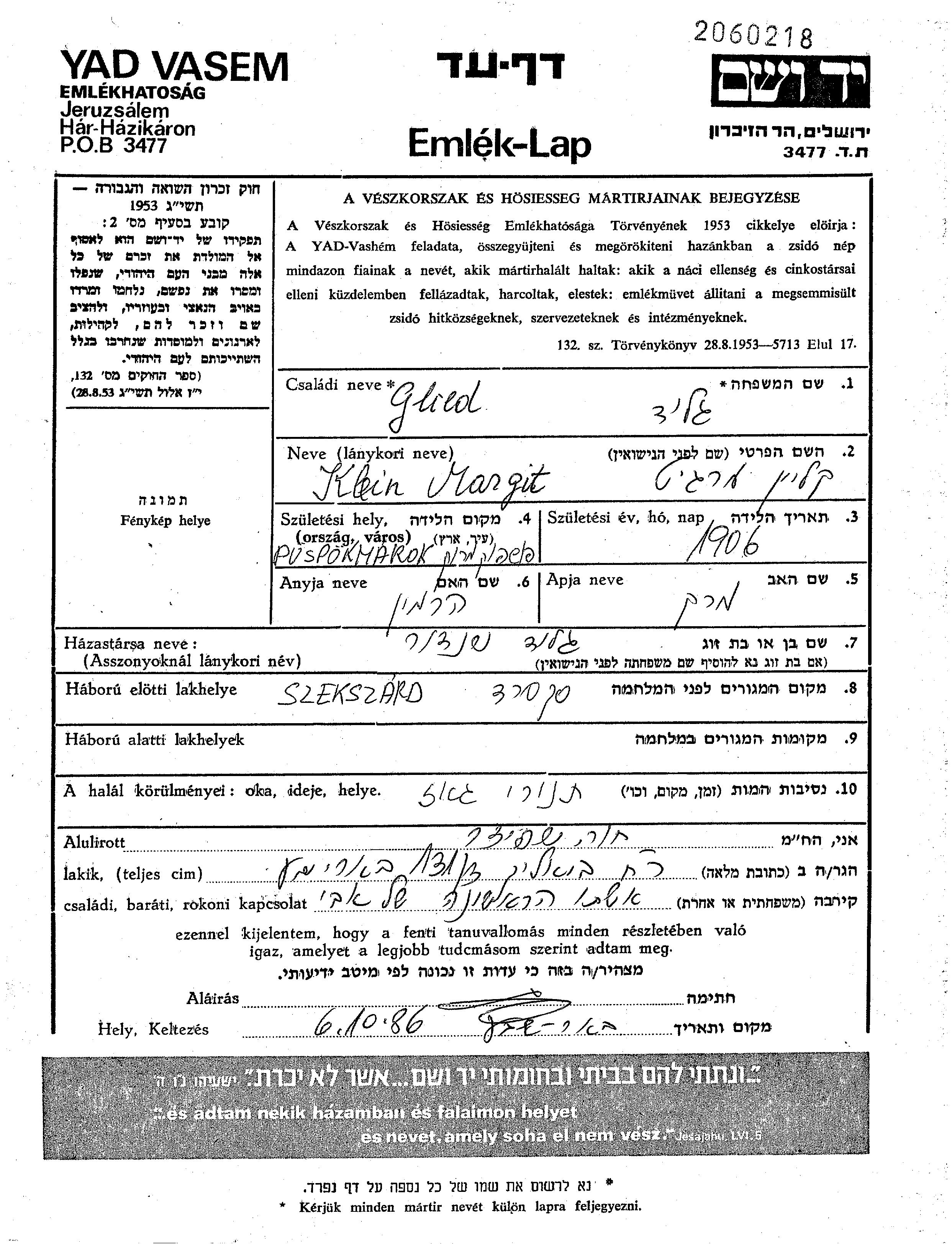 Glied Margit 1906 Szekszard, Hongrie Feuille de témoignage