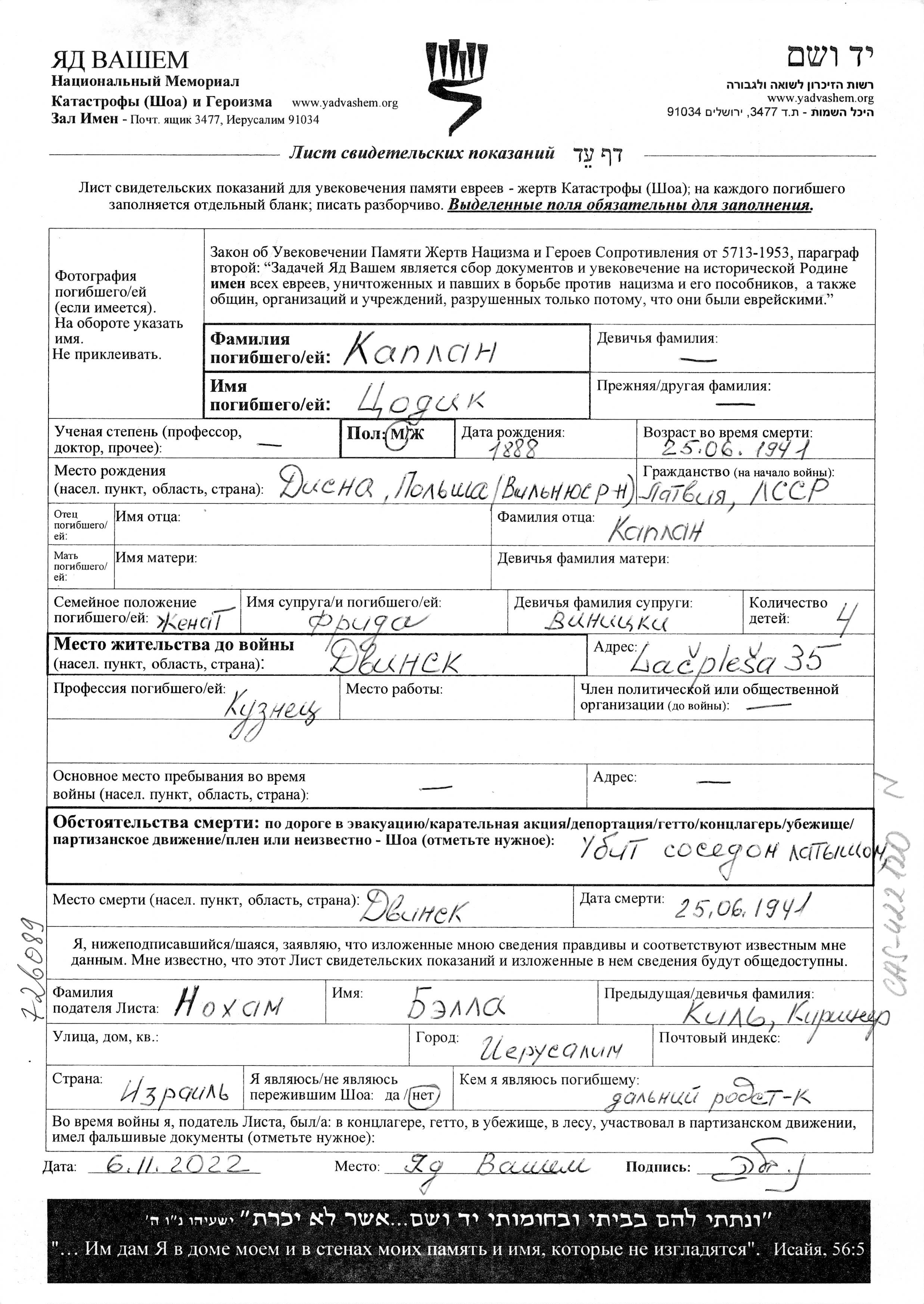 Tzodik Kaplan est né à Disna, Pologne en 1888. Il était Forgeron et Mariée à Frida née Vinitzki. Avant la seconde guerre mondiale il vivait à Dvinsk, Lettonie.