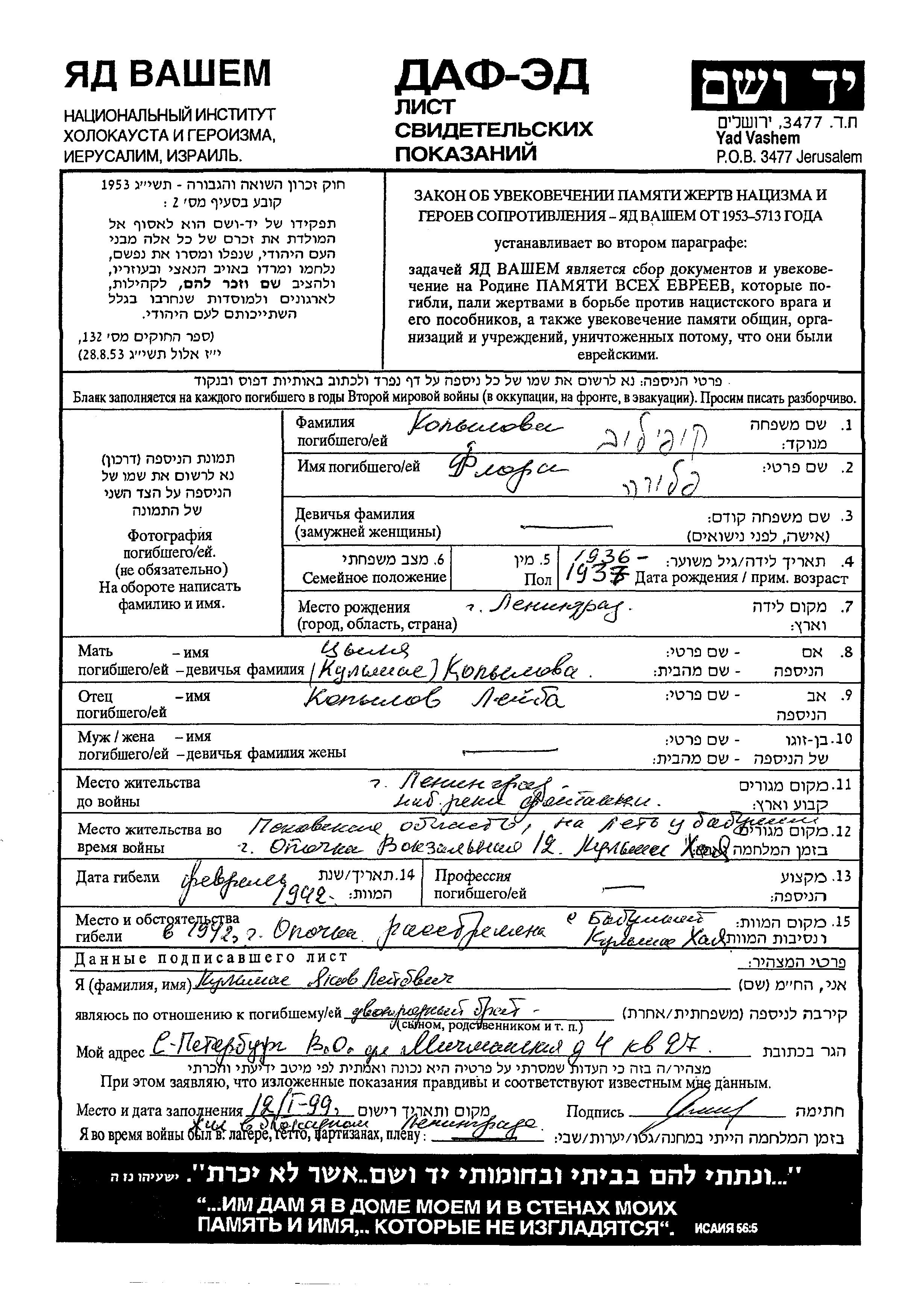 Kopylova Flora 1936 Leningrad, Russie (URSS) Feuille de témoignage