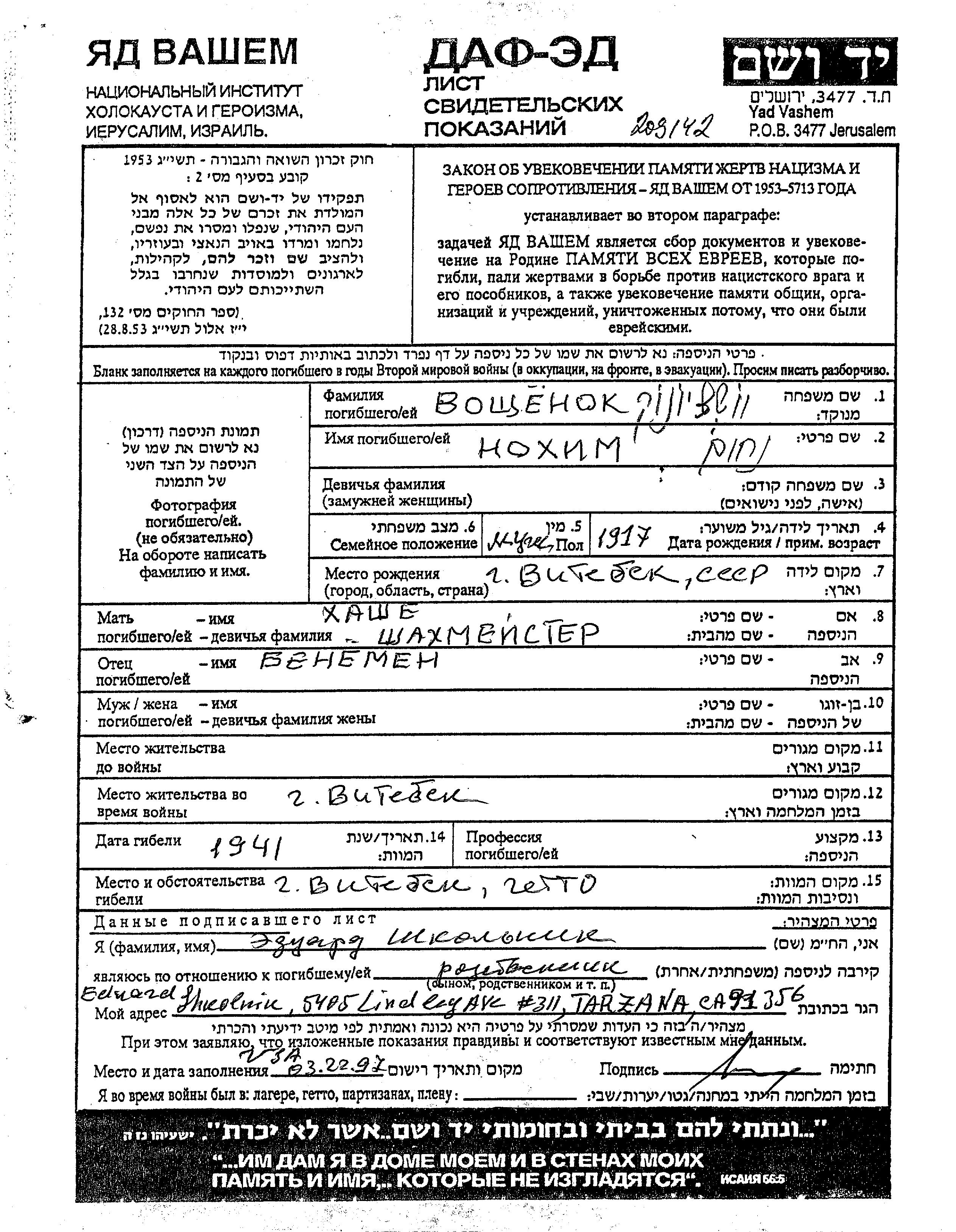 Voshchyonok Nokhim 1917 Vitebsk, Bélorussie (URSS) Feuille de témoignage