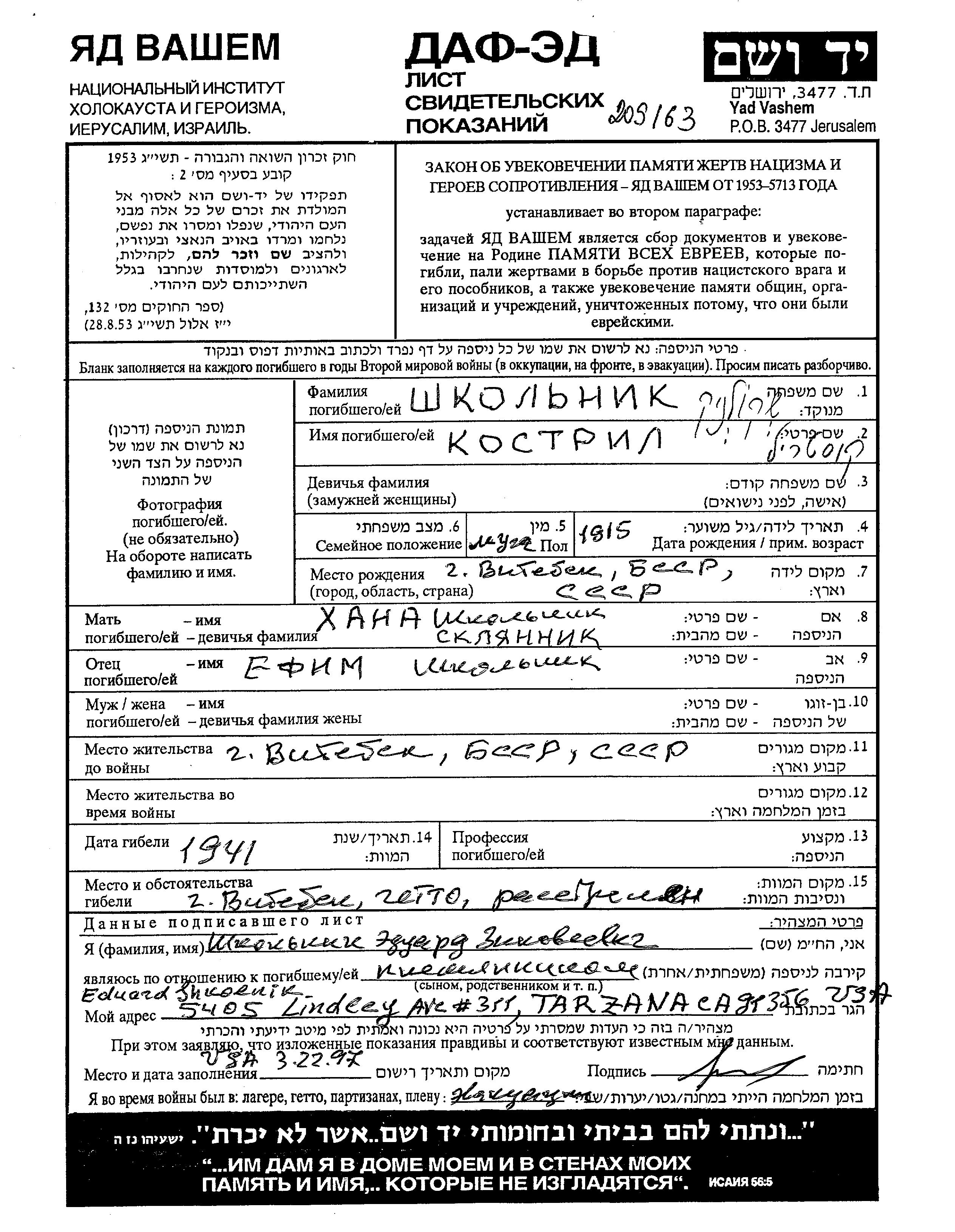 Shkolnik Kostril 1915 Vitebsk, Bélorussie (URSS) Feuille de témoignage